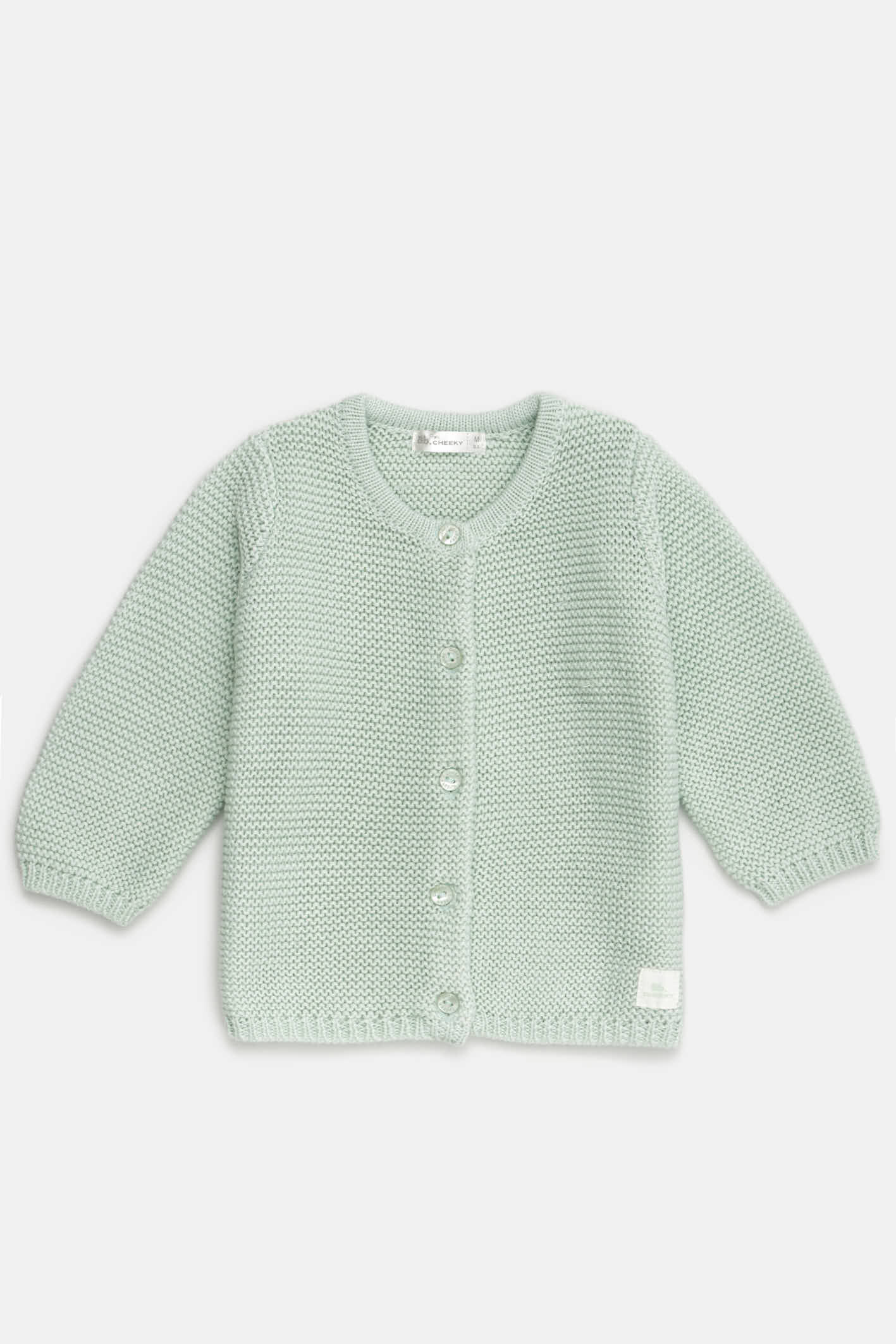 Nuestro cardigan Cozy presenta botones con logo y grifa de marca. Este tejido para bebes está hecho 100% algodón.