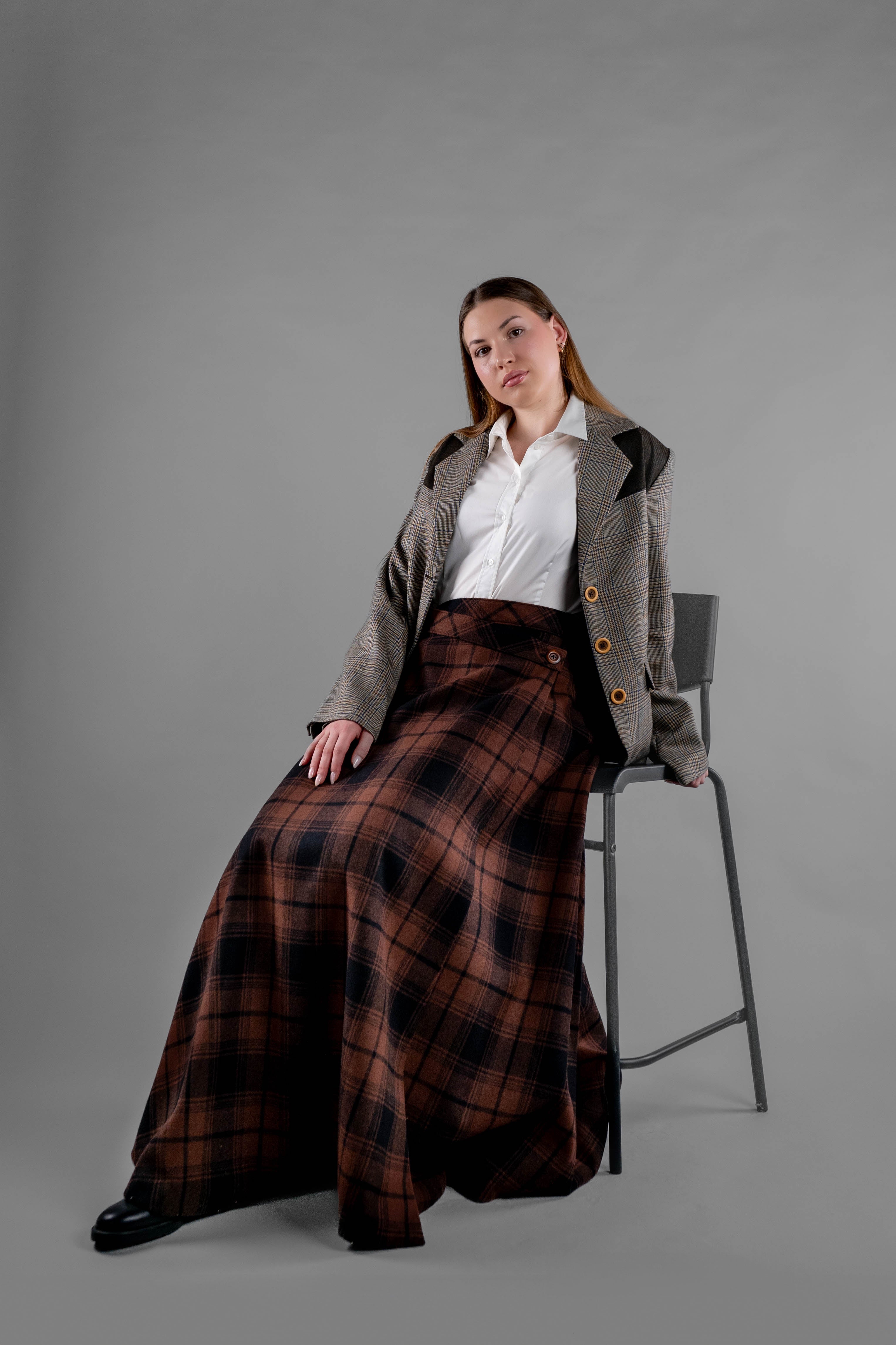 Esta falda envolvente luce un elegante estampado de tartán en tonos teja y negro, perfecto para quienes buscan estilo con personalidad. Su corte envolvente realza la silueta de forma favorecedora y ofrece comodidad gracias a su ajuste adaptable.