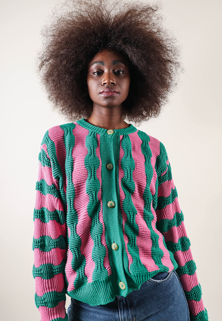 El jersey acaramelado verde y fucsia es un cárdigan de manga larga que combina un diseño único y colores vibrantes. Con cinco botones Carey en los puños y dobladillos delanteros, y un acabado acanalado, este cárdigan ofrece un toque de elegancia y confort. Ideal para agregar un toque de estilo a tu look, es perfecto para días frescos o para complementar cualquier conjunto.