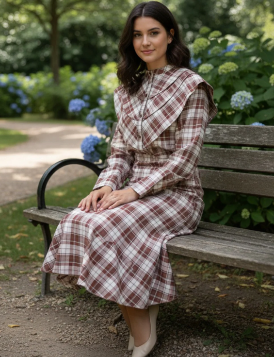 Diseñado en tonos cálidos de castaño y crema, combina una blusa estructurada con un canesú marcado y una falda amplia de línea fluida que cae con naturalidad y movimiento.