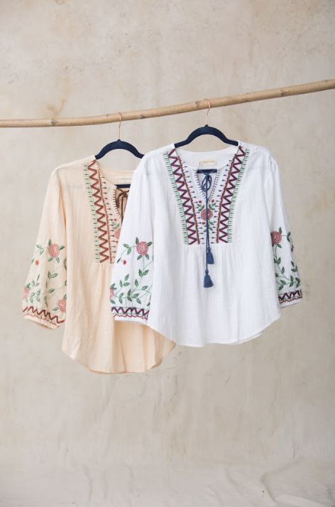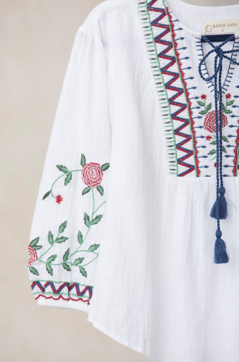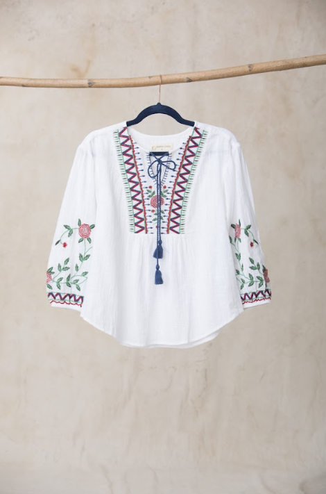 Esta blusa blanca destaca por su delicado bordado de flores alrededor del cuello y en las mangas. Con sus suaves cordones y hilos acompañados de borlas a juego, se convierte en una de las blusas más destacadas de la temporada, ideal para combinar con cualquier prenda.