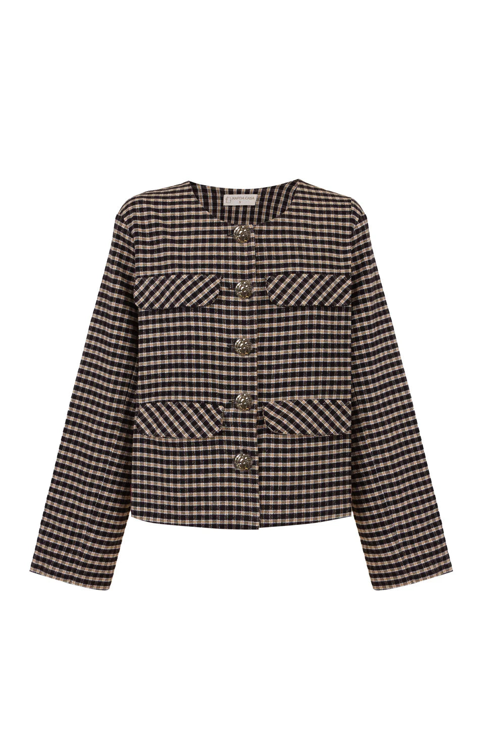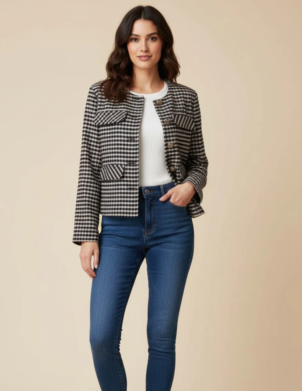 Confeccionada en un tejido de cuadros suaves en tonos negro y beige, se completa con botones dorados y bolsillos con solapa que evocan un estilo clásico y elegante.