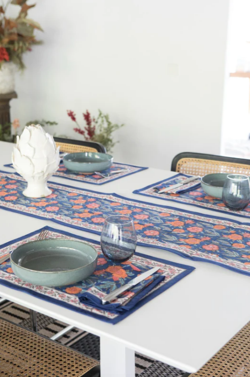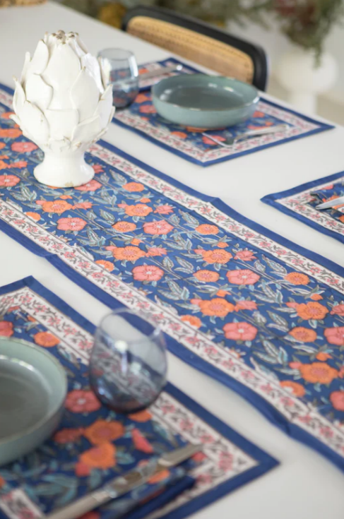 Este set de mantel en algodón presenta un diseño inspirado en el símbolo de una flor naranja, un color que representa el afecto y la amistad. Las flores de color naranja son perfectas para expresar gratitud y buenos deseos, convirtiéndolas en una excelente opción para cualquier ocasión especial. Este conjunto aportará un toque vibrante y lleno de energía a tu mesa, ideal para fomentar un ambiente cálido y amigable.