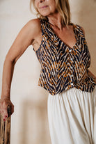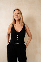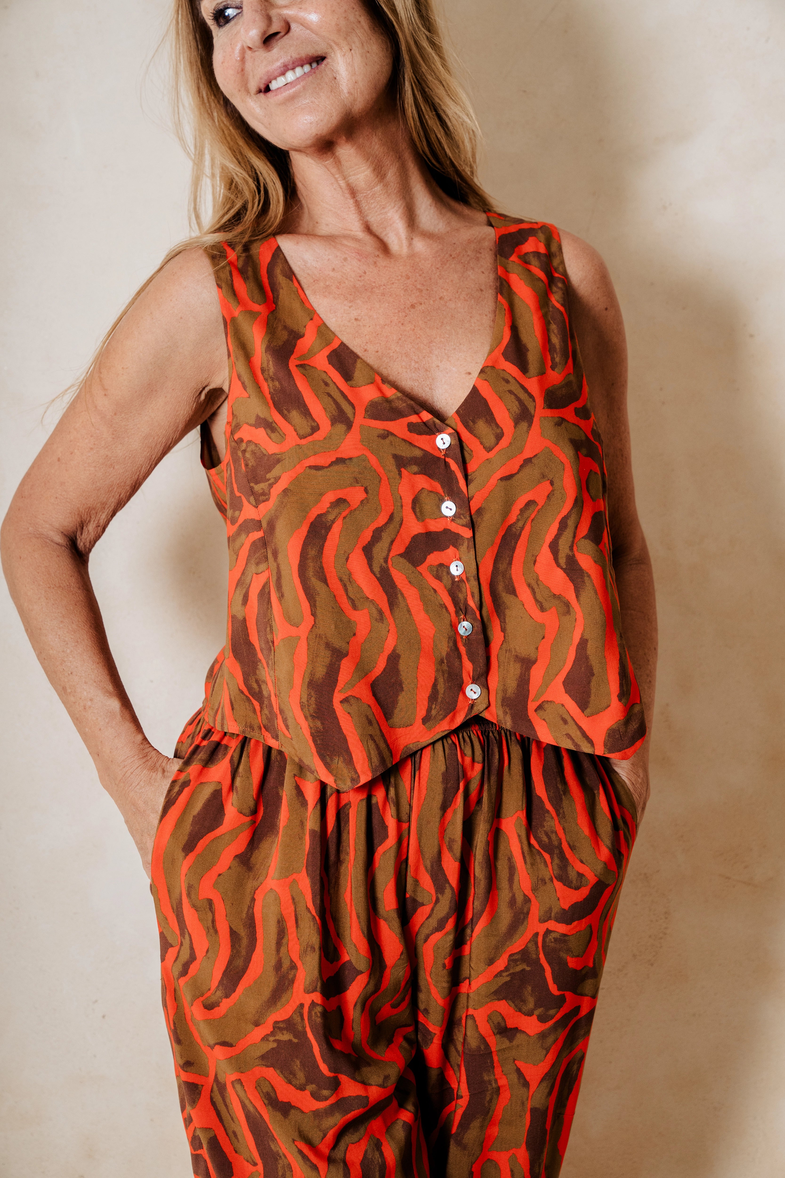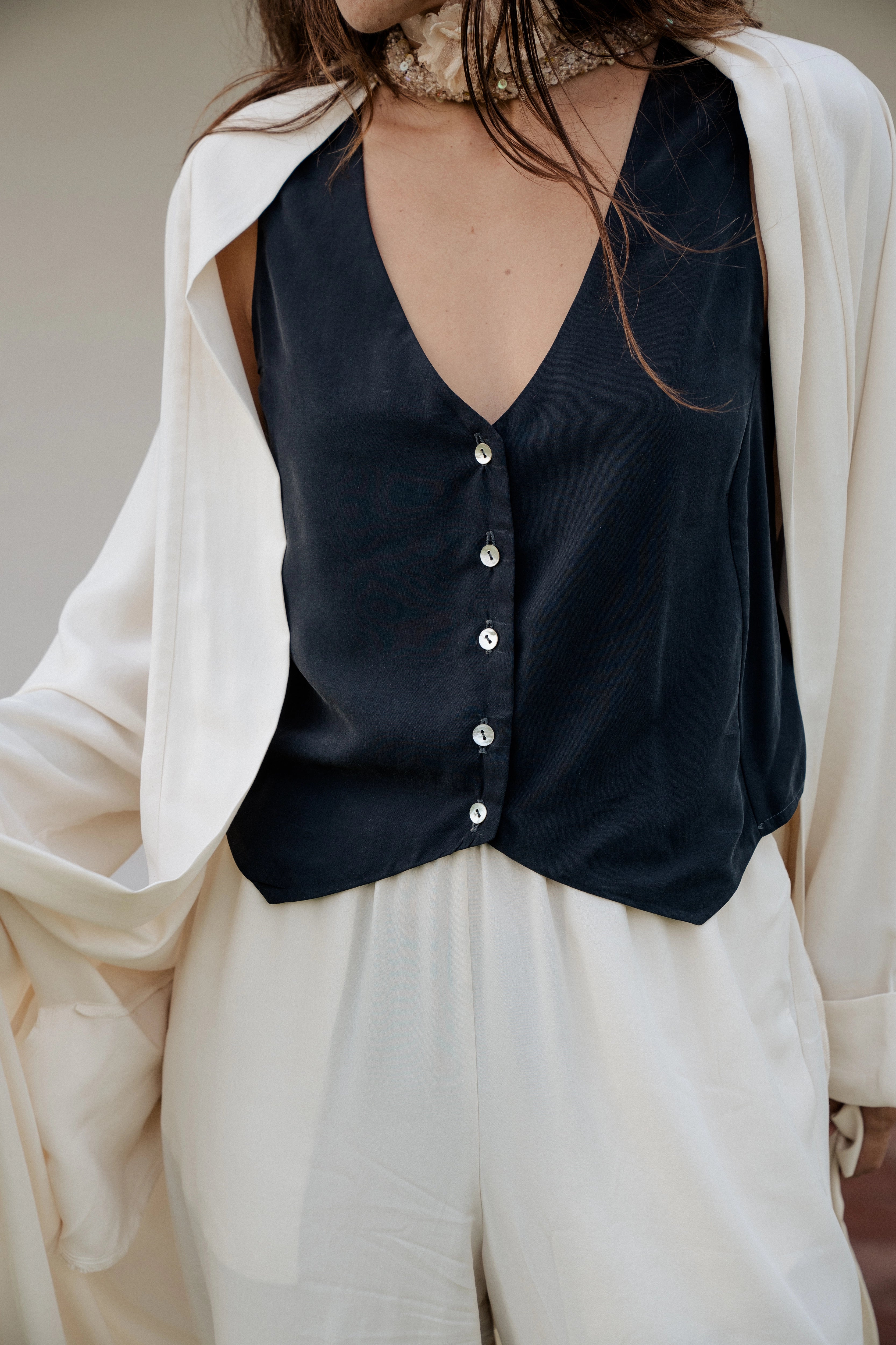 El chaleco Poeme es una prenda de elegancia atemporal, diseñada para combinar versatilidad y estilo. Destaca por su cuello pico pronunciado, cierre con botones de nácar y un lazo trasero ajustable, que realza la silueta. Materiales: Poeme está confeccionado en Viscosa EcoVero. Esta viscosa deriva de la pulpa de la madera de los árboles y es biodegradable.