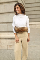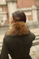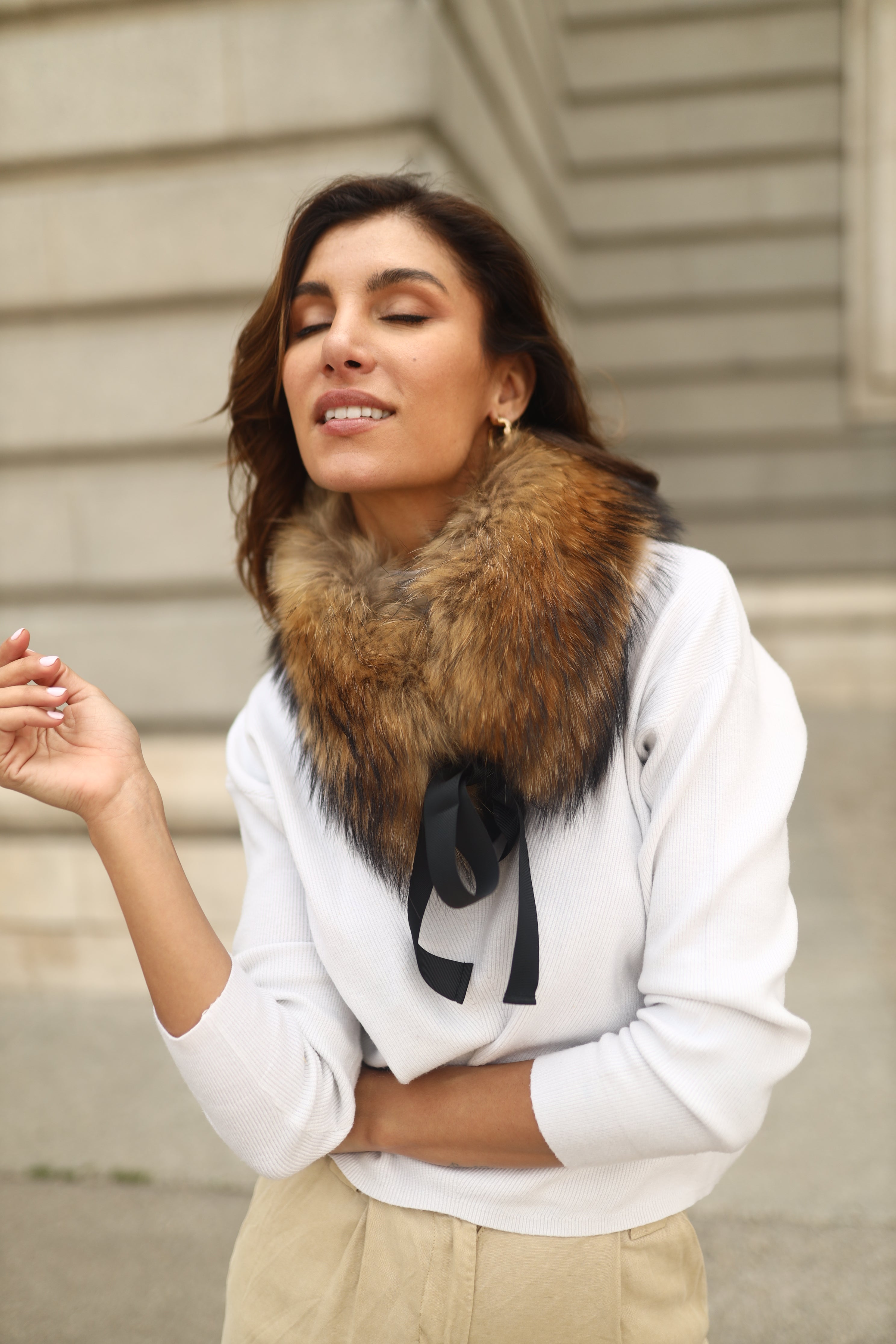 Elegante cuello de piel de mapache con cierre tipo lazo, ideal para añadir un toque de distinción a tus abrigos o chaquetas. Su diseño versátil lo convierte en el complemento perfecto para cualquier estilo.