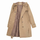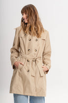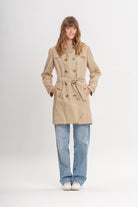 Trench cruzado con doble abotonadura, bolsillos y solapas en el frente.