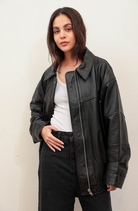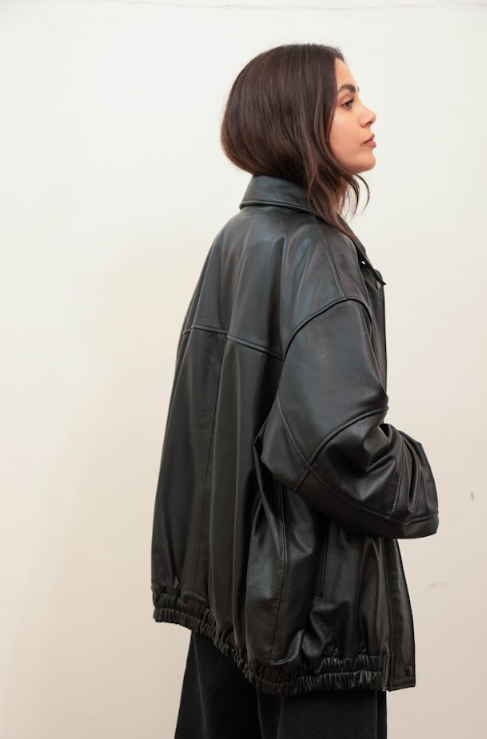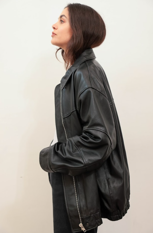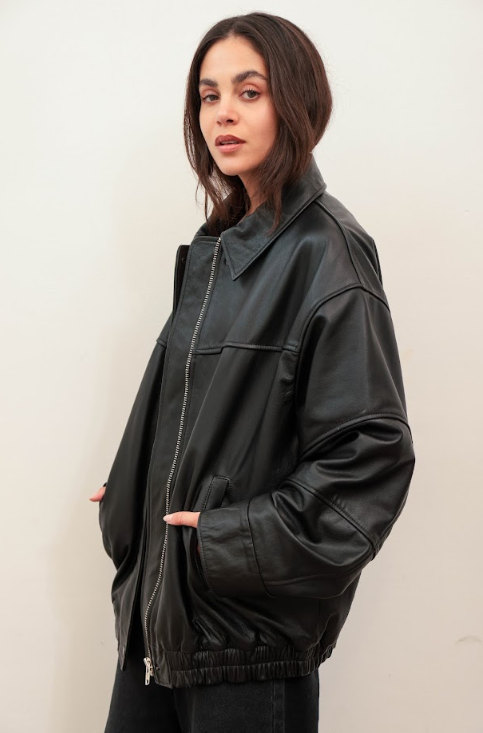Campera BOMBER larga oversize. cuello con solapa, cierre desmontable frontal, bolsillos frontales con cierre, y broche a presión.