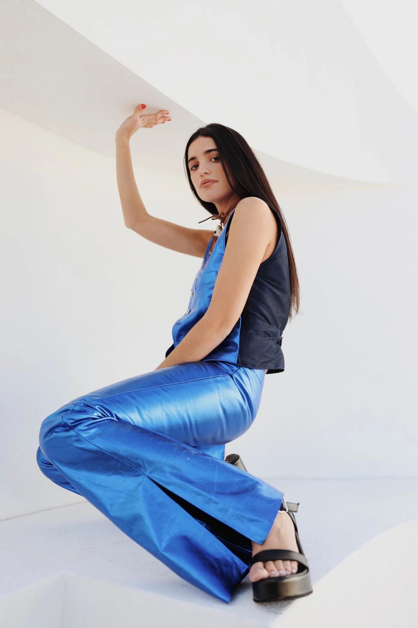 El Pantalón Formal de Cuero Azul Galáctico redefine el clásico pantalón de cuero con un diseño sofisticado y de corte elegante. Su silueta estilizada, acampanada en la parte inferior y con tajos sutiles, lo convierte en una prenda versátil y moderna, ideal para looks tanto formales como vanguardistas.