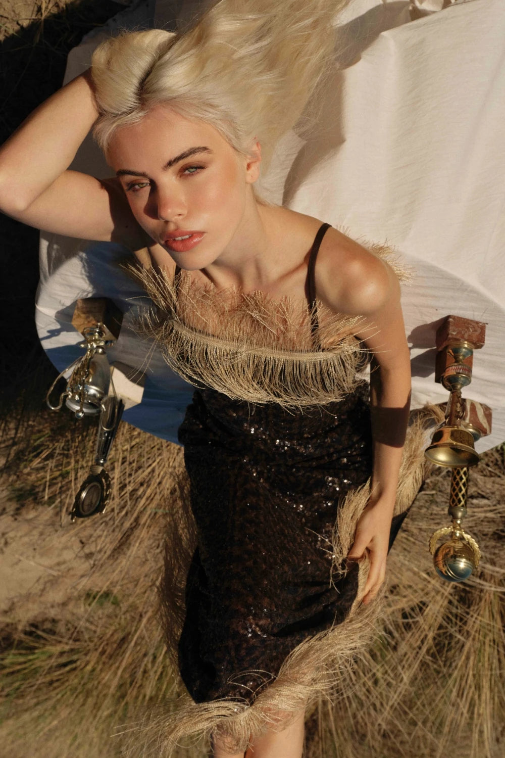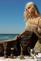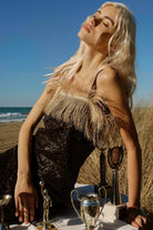 Vestido largo con escote recto con los hombros al descubierto. La tela es de lentejuelas con detalles en el escote y en el dobladillo en rafia.