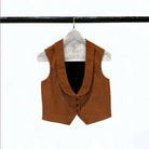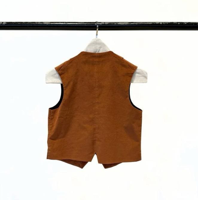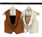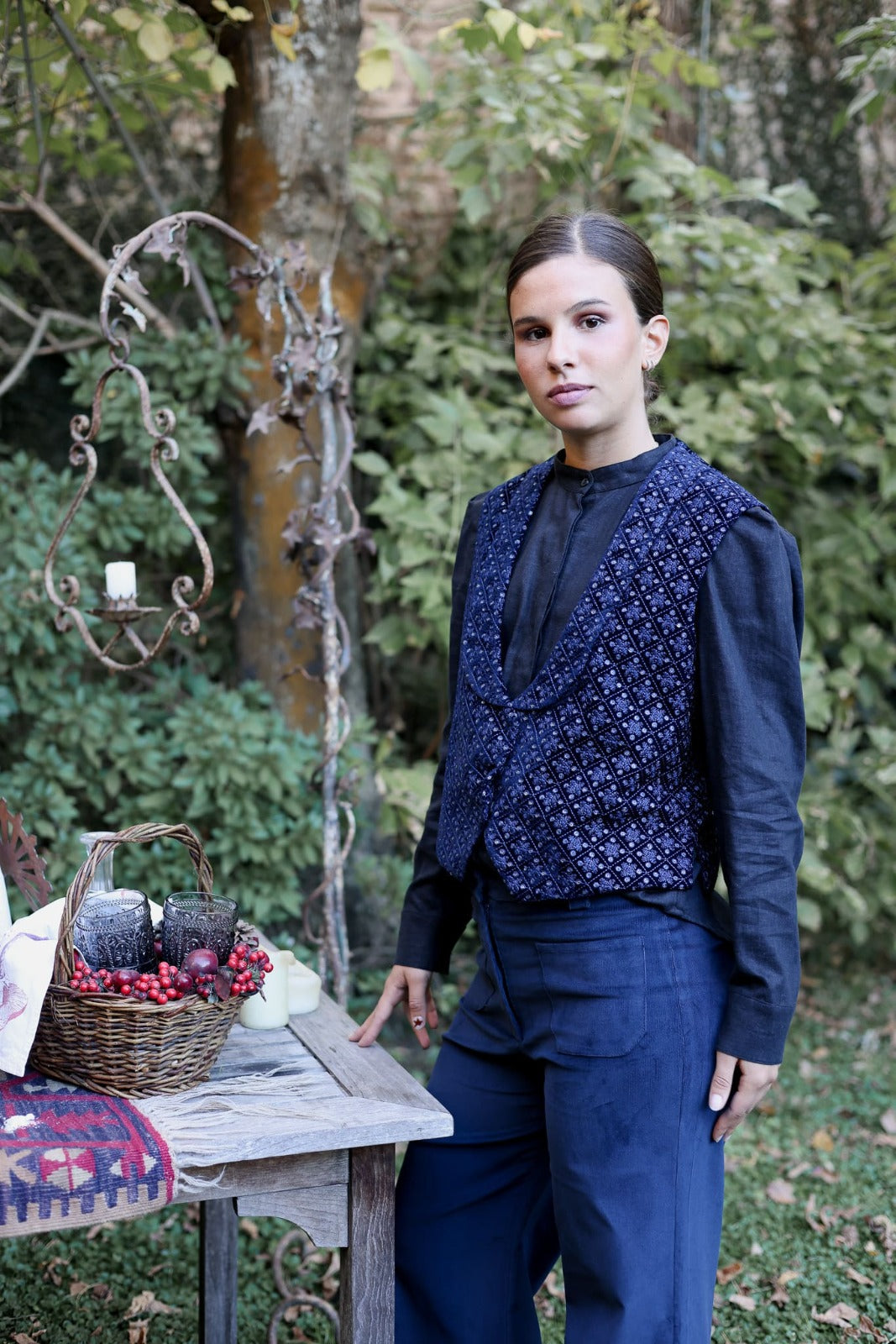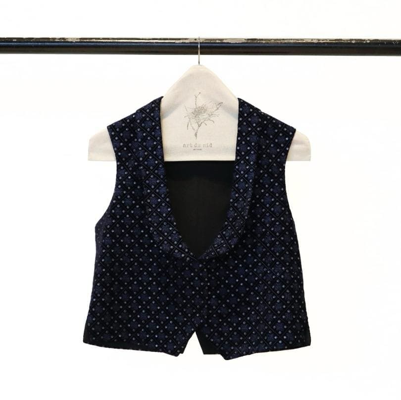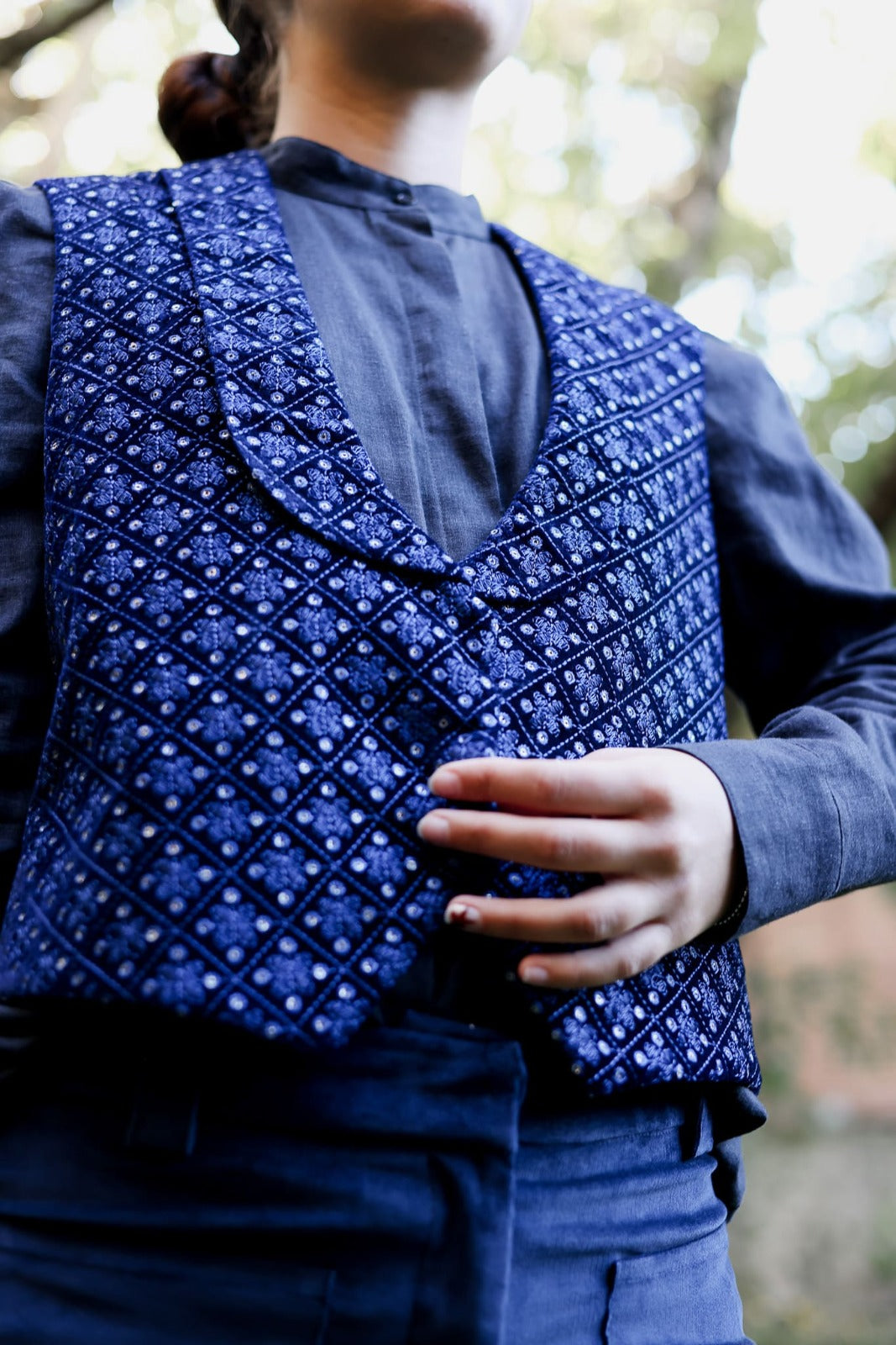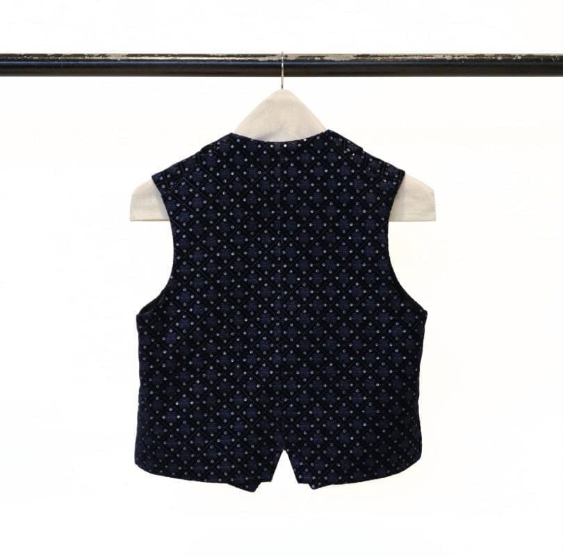 Chaleco gala, azul de velvet con lentejuela y bordados fantasía. Con cuello tipo smoking, con tres botones, entallado. Ajuste con cinta en espalda.