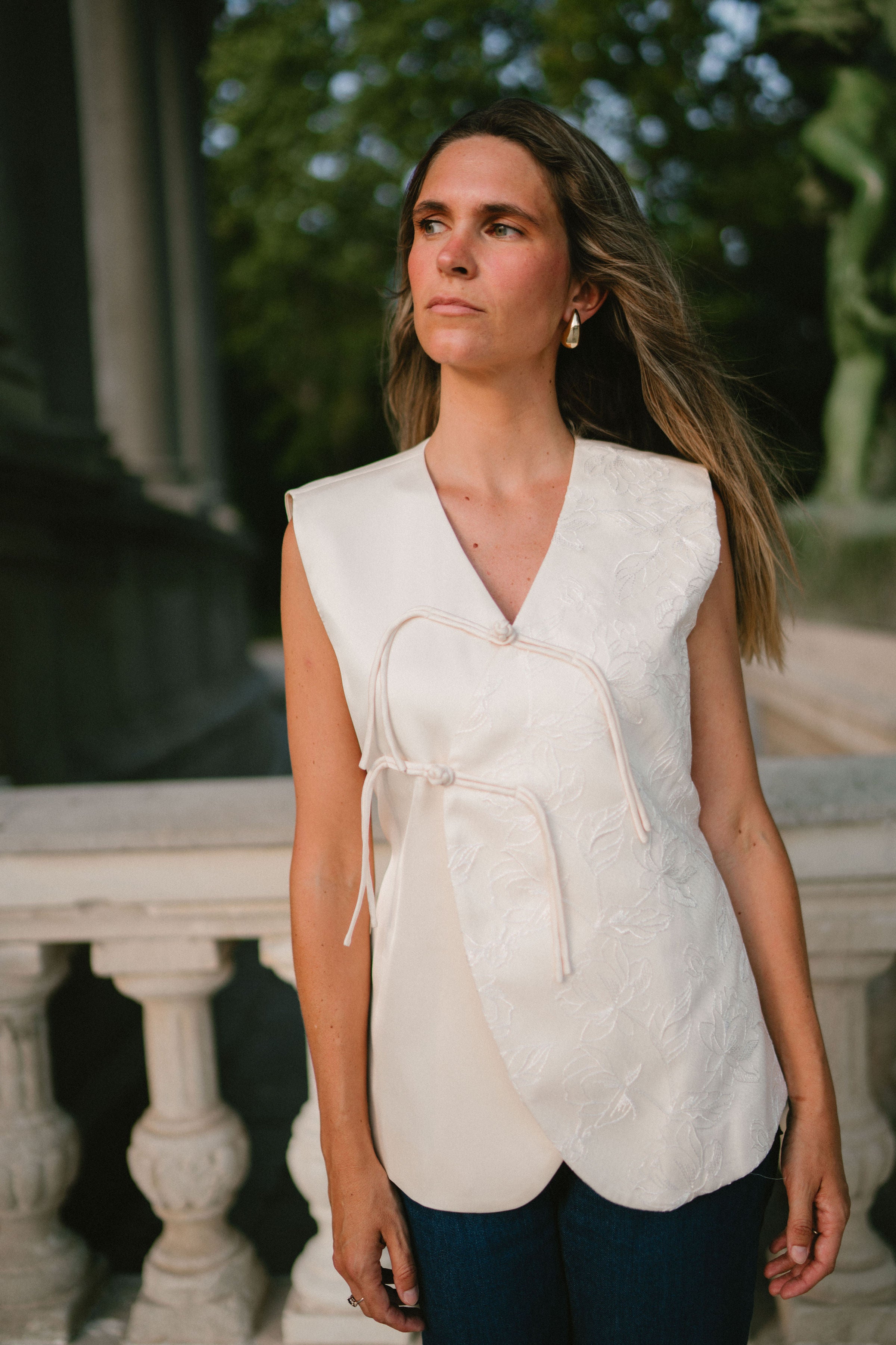 Chaleco oversize, artesanal y ajustable en la espalda. Satinado en tono hueso, combina delicadamente encaje y lazos en la espalda para ajustar la silueta. Los broches, forrados a mano en satén, son el cierre perfecto y diferente. Está diseñado para que quede suelto, si te gusta más ajustado, escoge una talla menos de lo habitual.