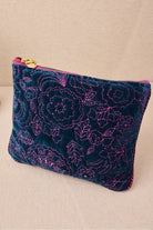 Bolsita de terciopelo en tamaño grande con diseño de rayas multicolor y cierre con borla. Decorada con bordados de hilos en contraste, es ideal para llevar lo imprescindible con un toque alegre y sofisticado.