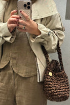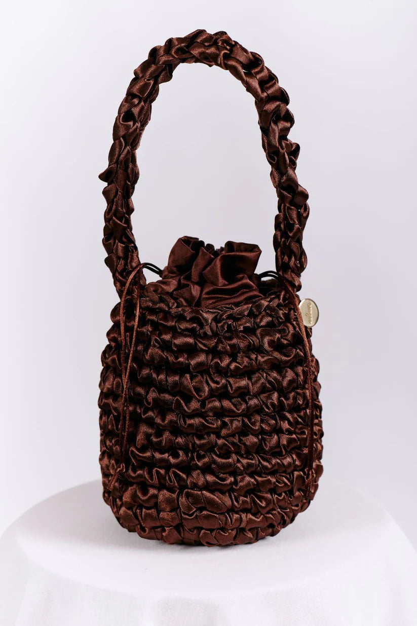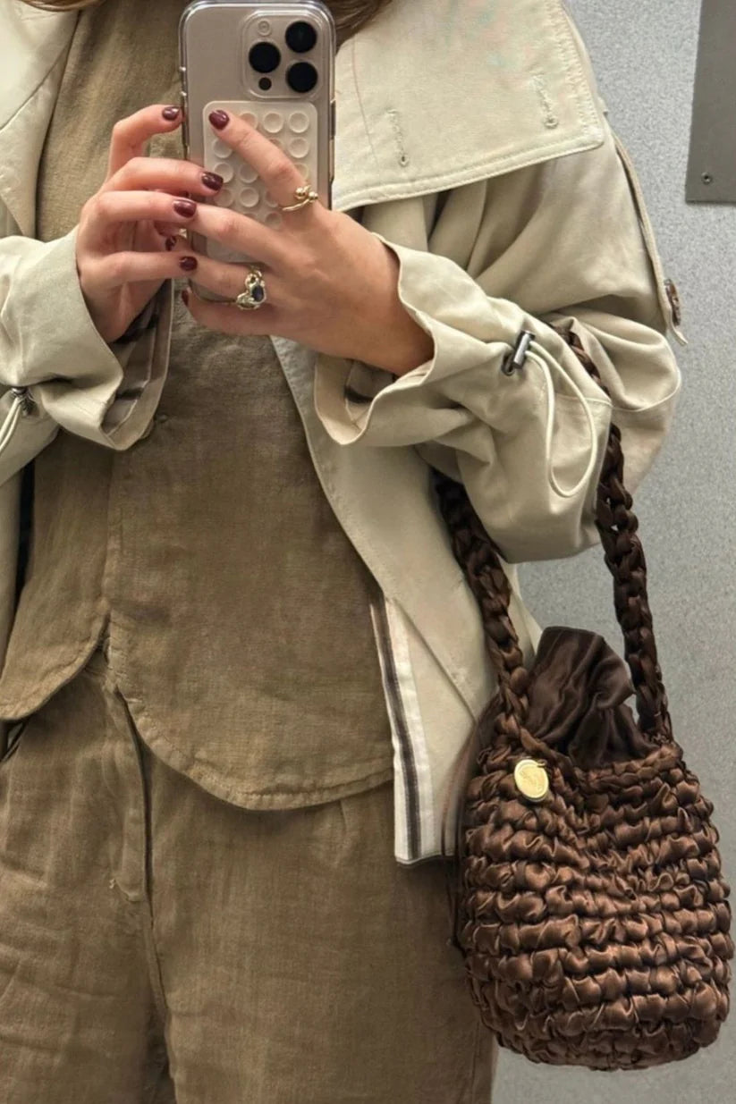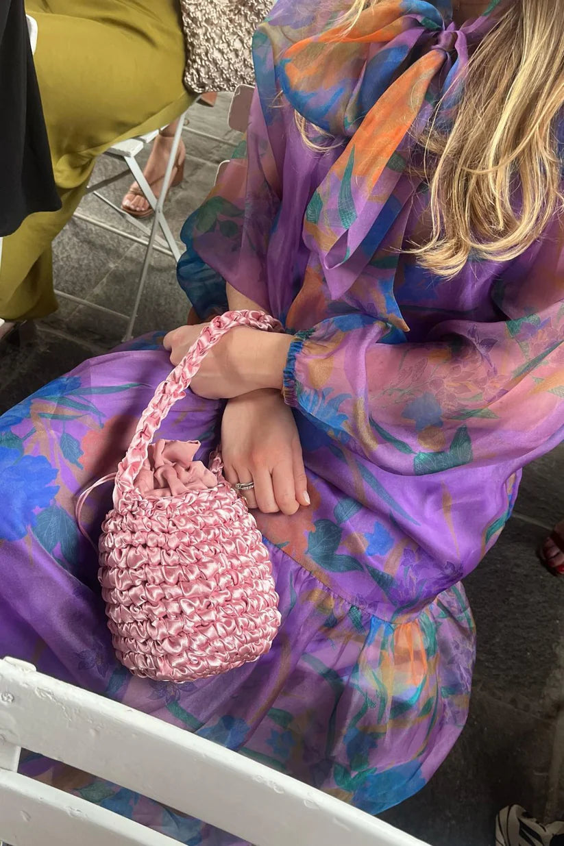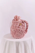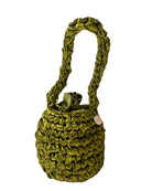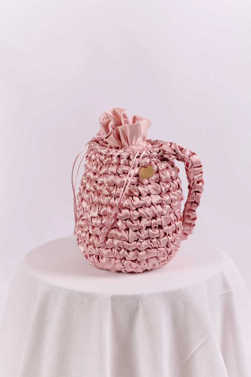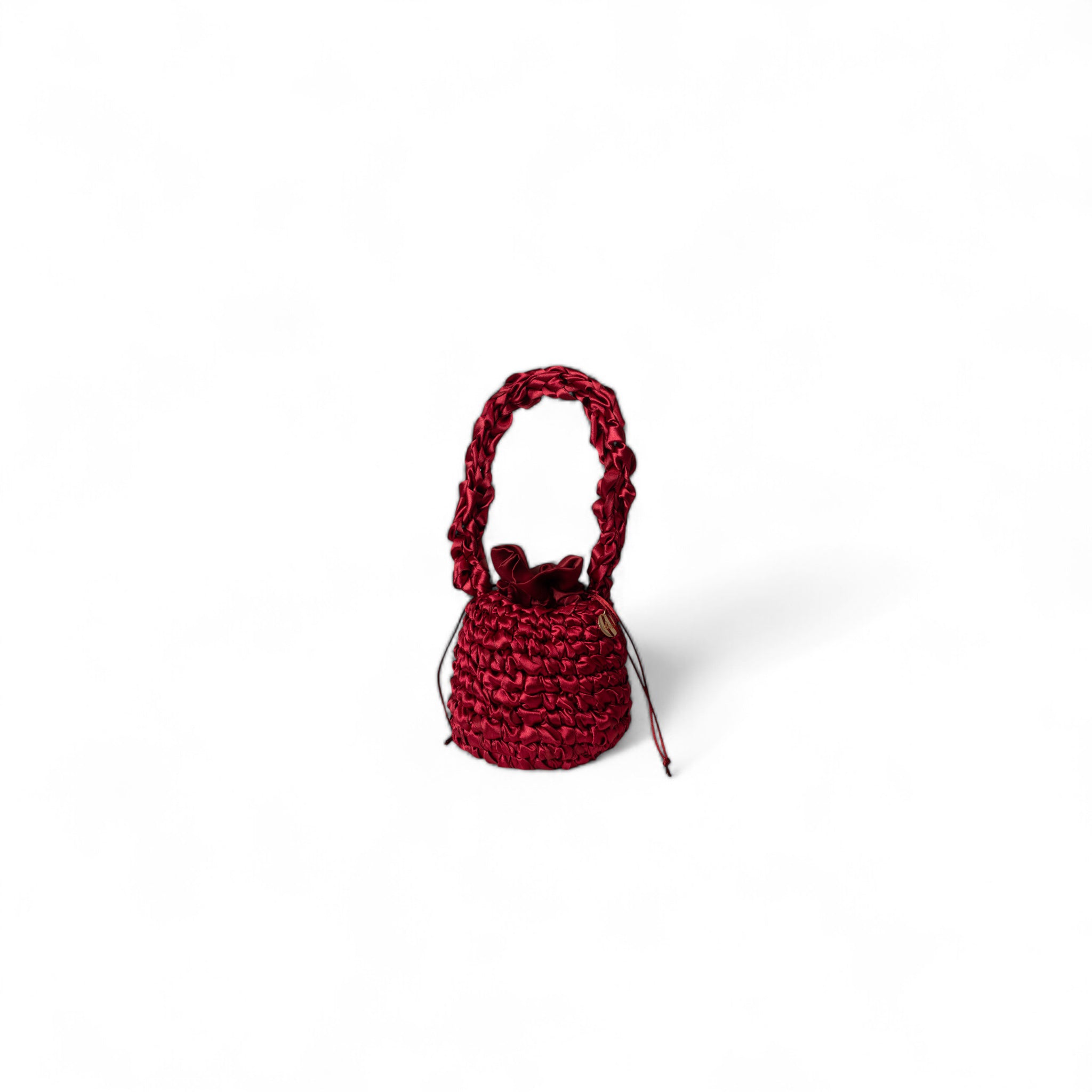 Bolso tejido a mano con cinta, un accesorio único que combina la elegancia y la funcionalidad. Su forro satinado protege el interior y le da un toque de sofisticación. Con un diseño práctico, cuenta con un asa corta para llevarlo en la mano, convirtiéndolo en el complemento ideal para cualquier ocasión. Su estilo artesanal y delicado lo hace perfecto para quienes buscan un accesorio exclusivo y versátil.