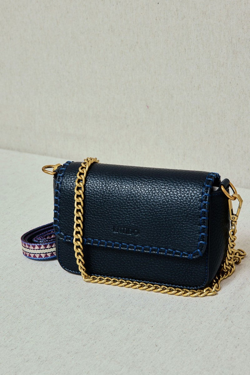 Diseñado en piel ecológica con acabados metálicos, este bolso de formato reducido destaca por su cadena dorada y sus pespuntes hechos a mano. Un toque sofisticado para looks casuales o más arreglados.
