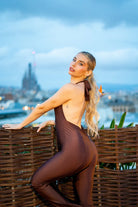 Mono largo con escote en V profundo y aplicaciones de broches metálicos en straps. Espalda descubierta. Silueta ajustada con tela efecto satinado.