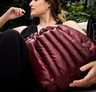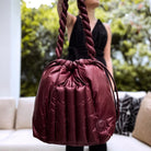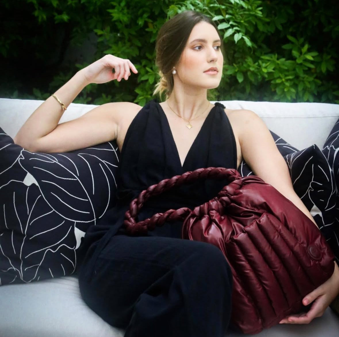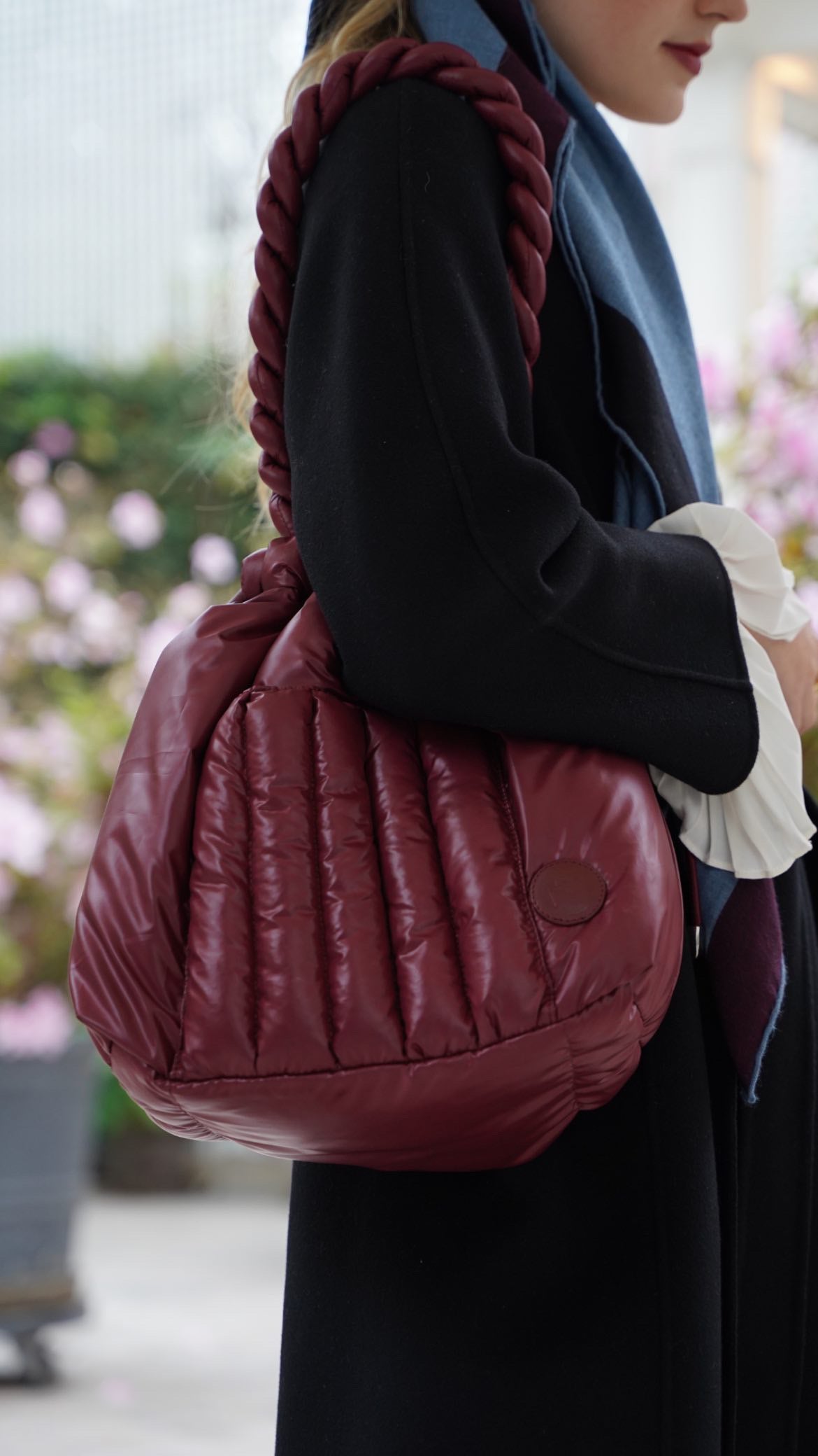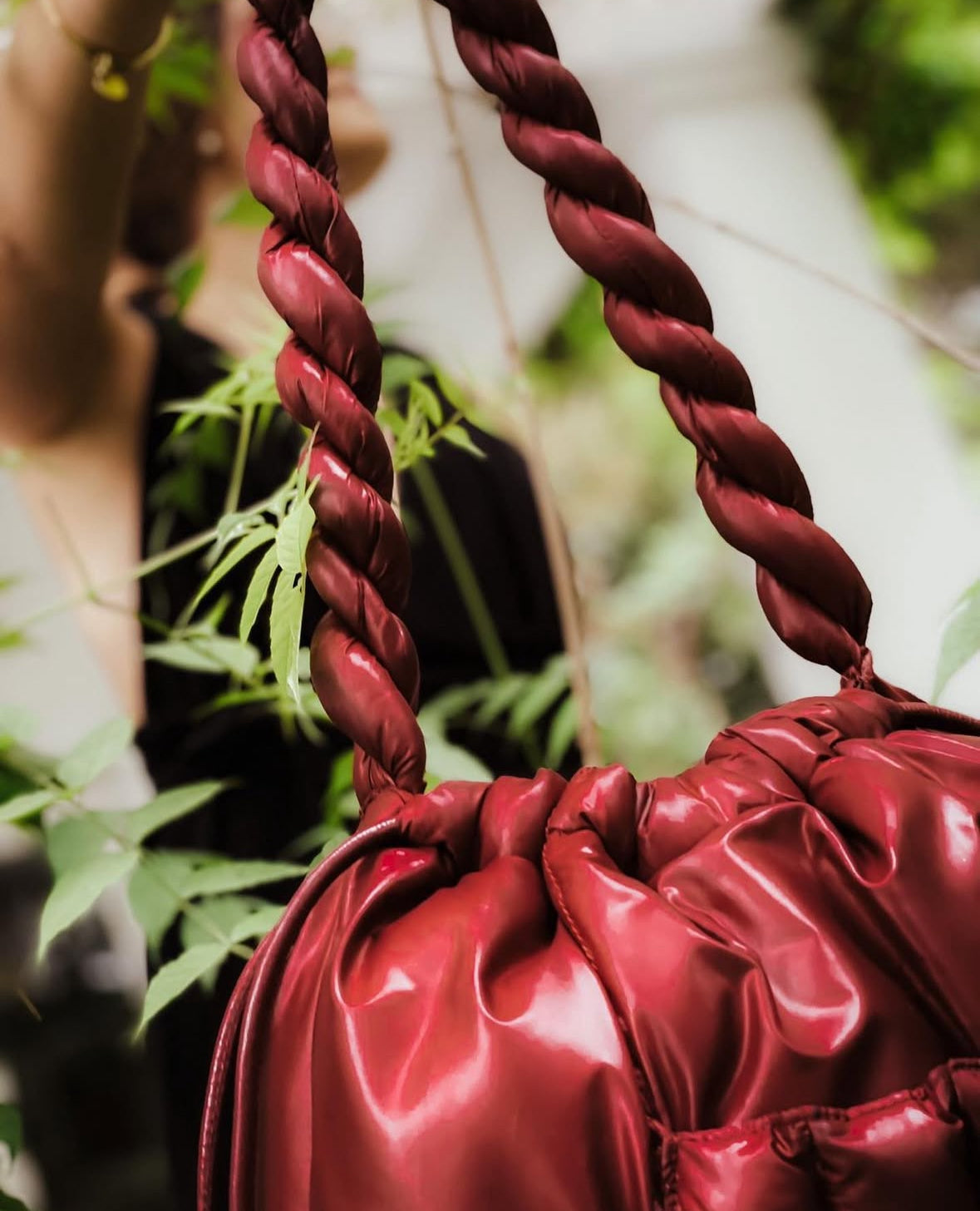 En un elegante tono burdeos. El bolso Delia Está confeccionado en nylon reciclable acolchado con acabado satinado, lo que le da un aire moderno y lujoso. Su diseño se distingue por el asa gruesa y trenzada, que aporta textura y carácter.