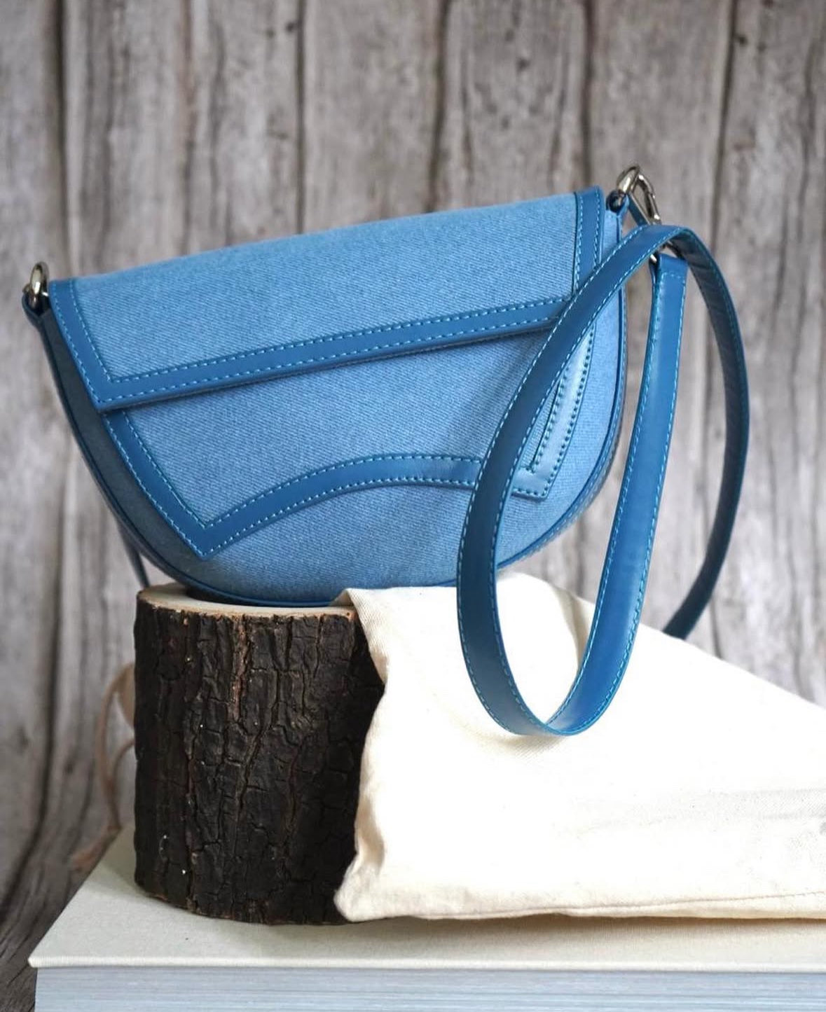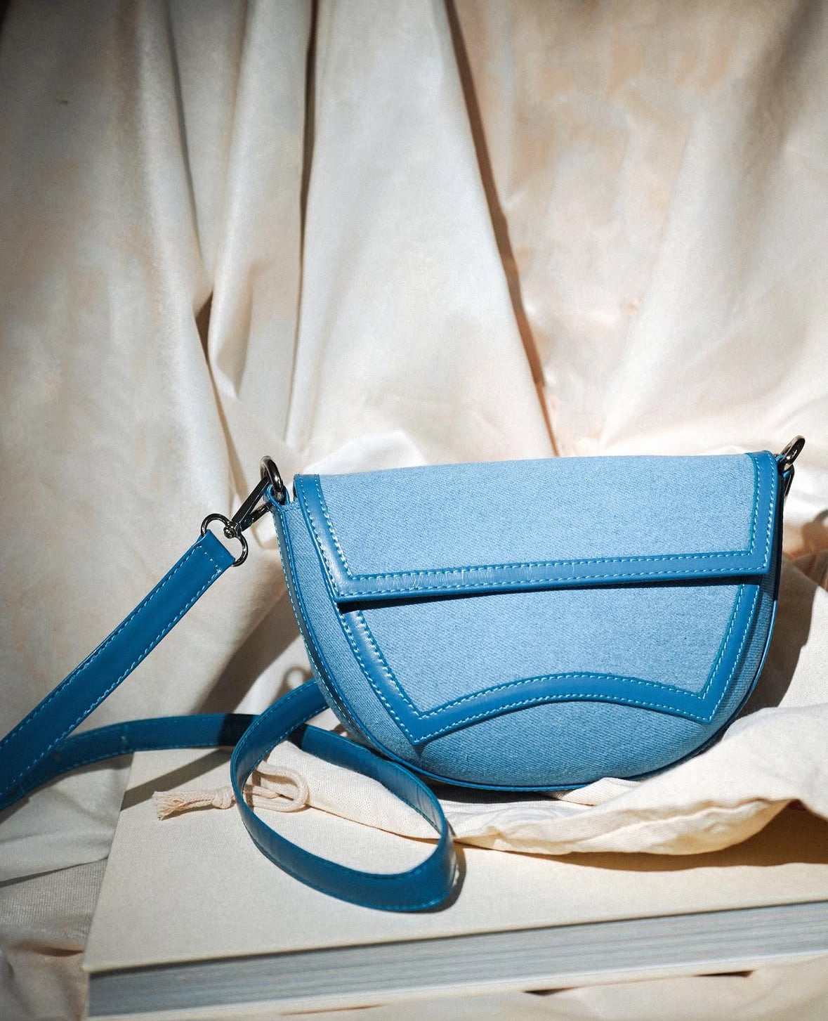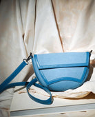 Este elegante bolso presenta una silueta estructurada de líneas suaves y curvas. Confeccionado en cuero liso color jean, su tapa destaca por un detalle central en relieve con pespuntes decorativos que aportan carácter y originalidad.