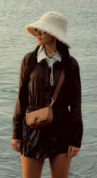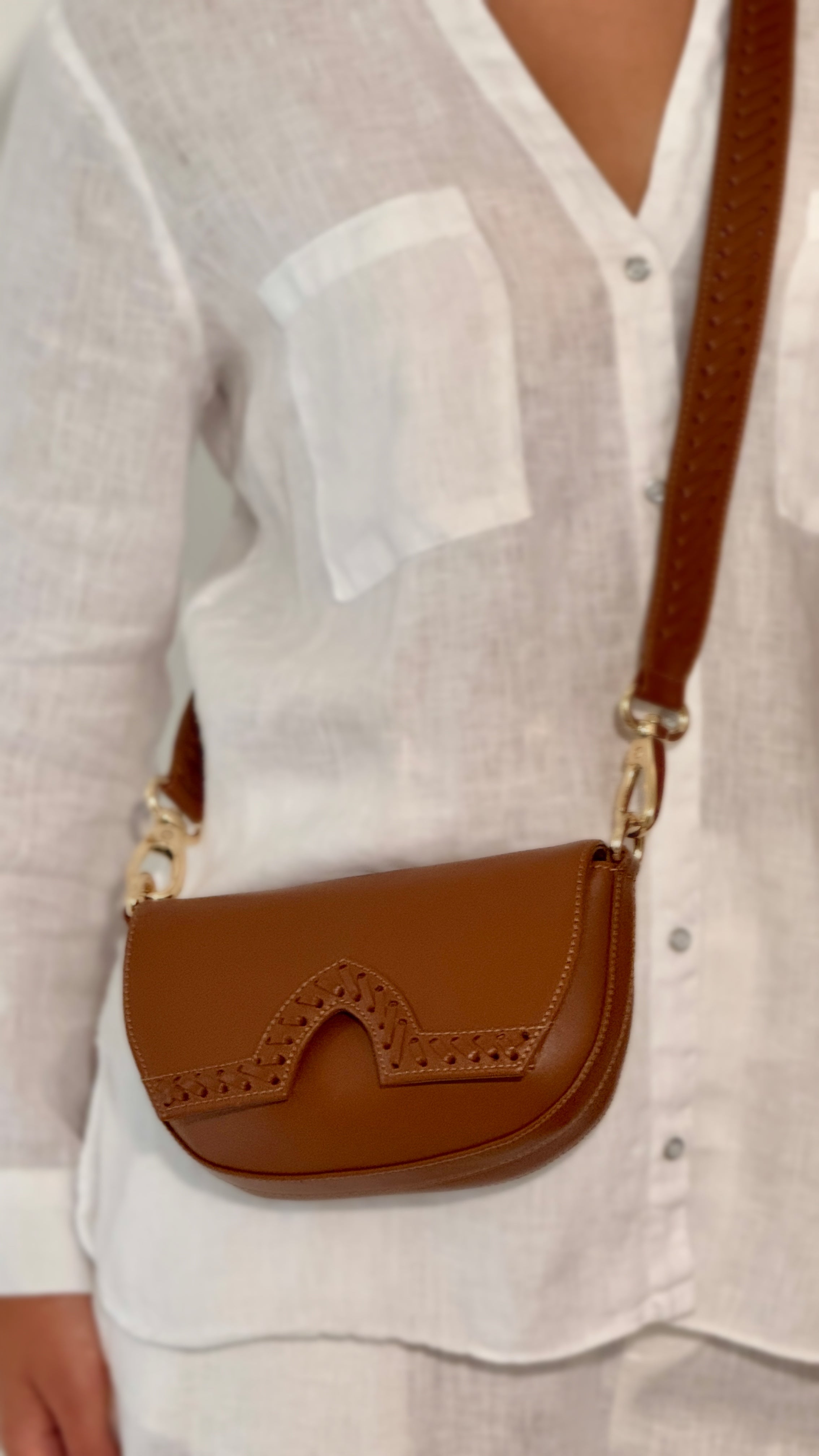 Este elegante bolso presenta una silueta estructurada de líneas suaves y curvas. Confeccionado en cuero liso color caramelo, su tapa destaca por un detalle central en relieve con pespuntes decorativos que aportan carácter y originalidad.
