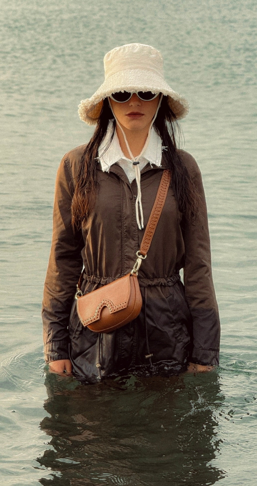 El asa, removible o ajustable, repite el mismo pespunte artesanal, creando una armonía visual en todo el diseño. El cierre es magnético, lo que refuerza su estética