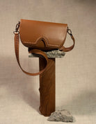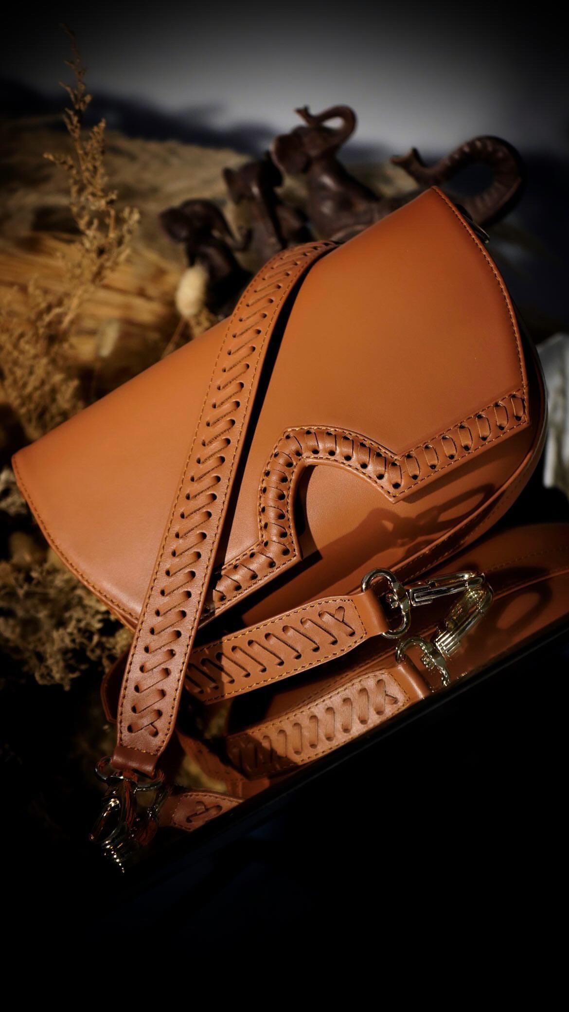 Este elegante bolso presenta una silueta estructurada de líneas suaves y curvas. Confeccionado en cuero liso color caramelo, su tapa destaca por un detalle central en relieve con pespuntes decorativos que aportan carácter y originalidad.