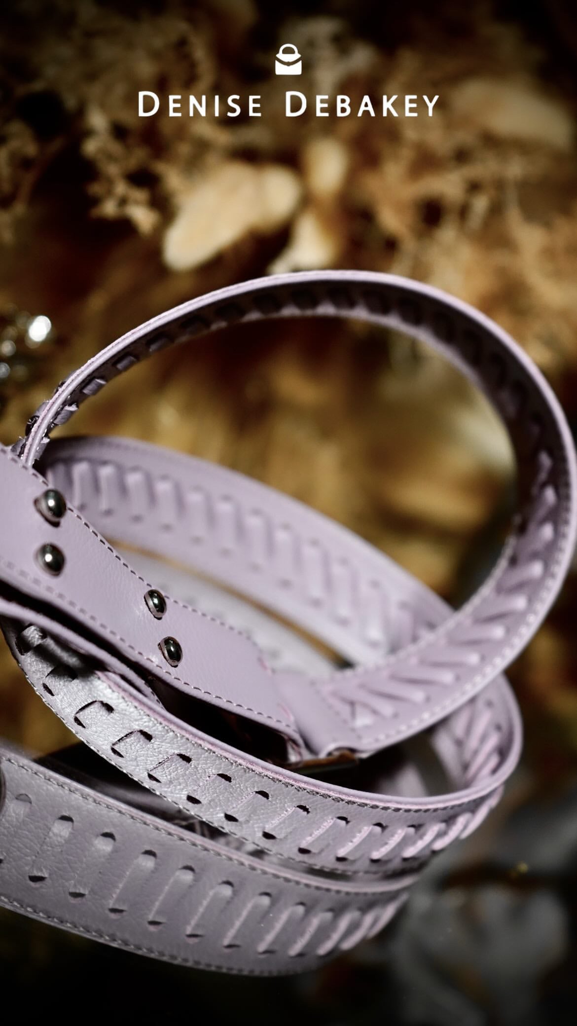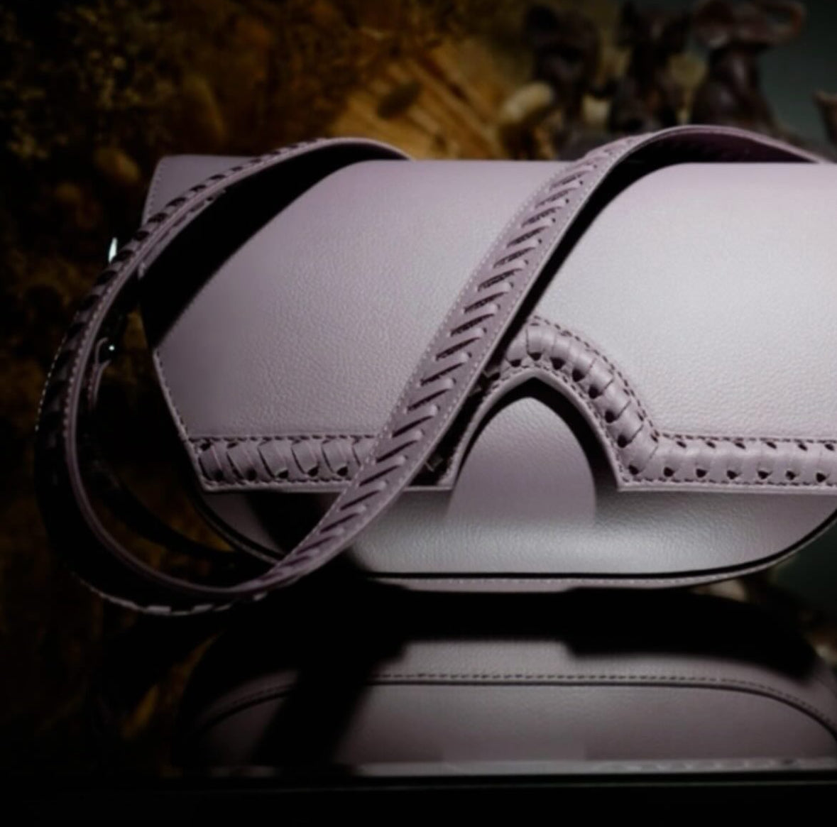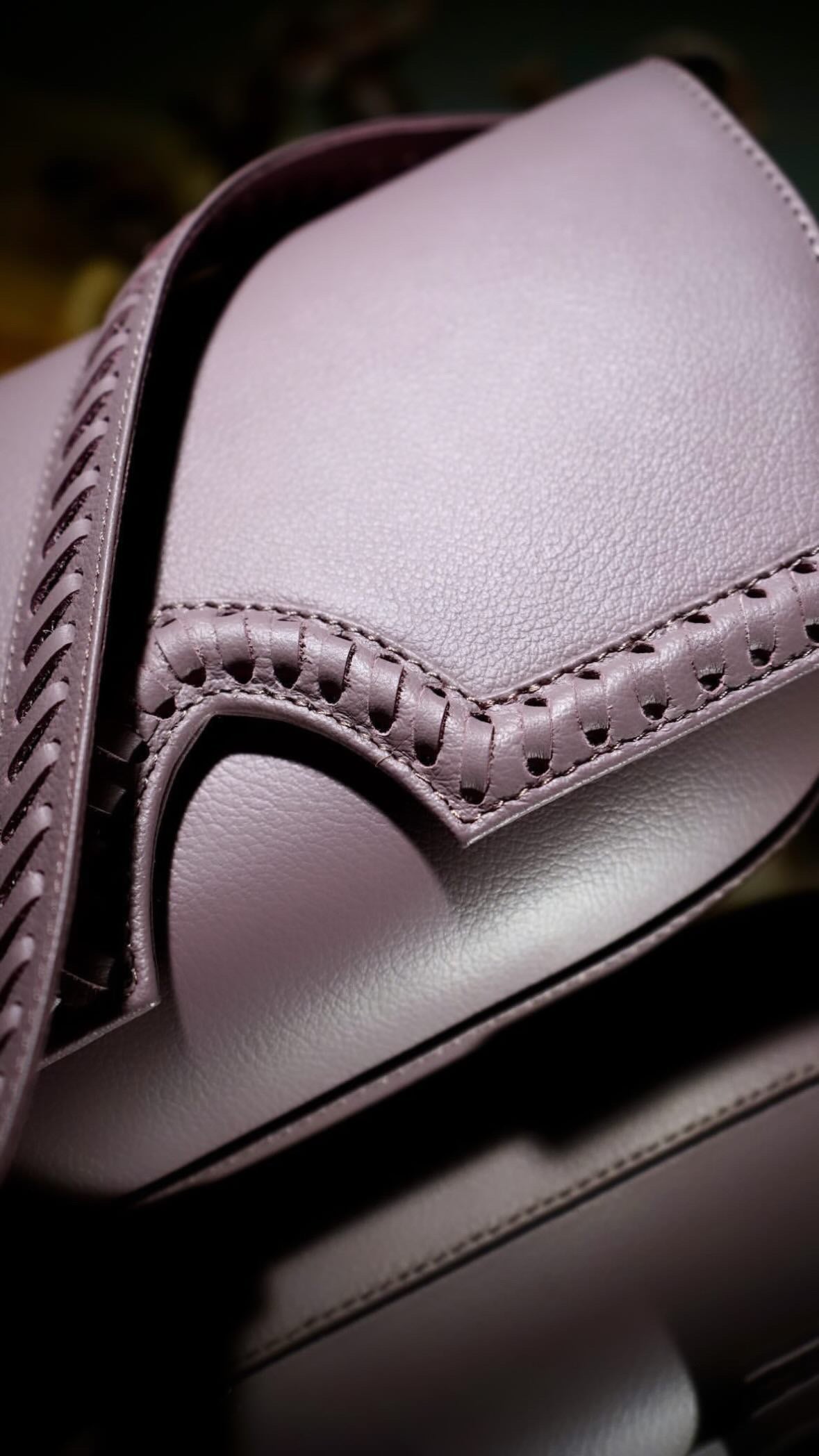 Este elegante bolso presenta una silueta estructurada de líneas suaves y curvas. Confeccionado en cuero liso color malva, su tapa destaca por un detalle central en relieve con pespuntes decorativos que aportan carácter y originalidad.