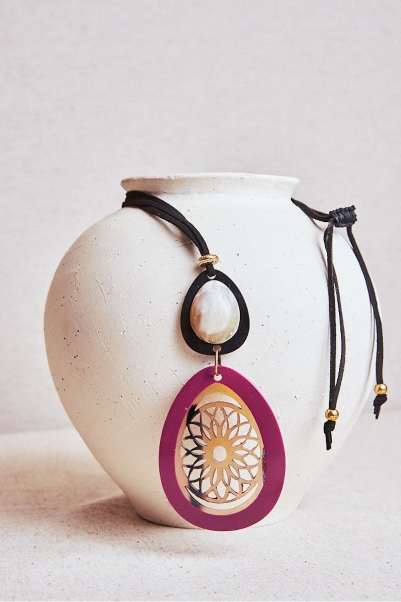 Una pieza de inspiración natural con aire contemporáneo. El colgante labrado en resina y con detalle de pieza central, juega con la geometría y el color en una composición que aporta presencia sin rigidez.