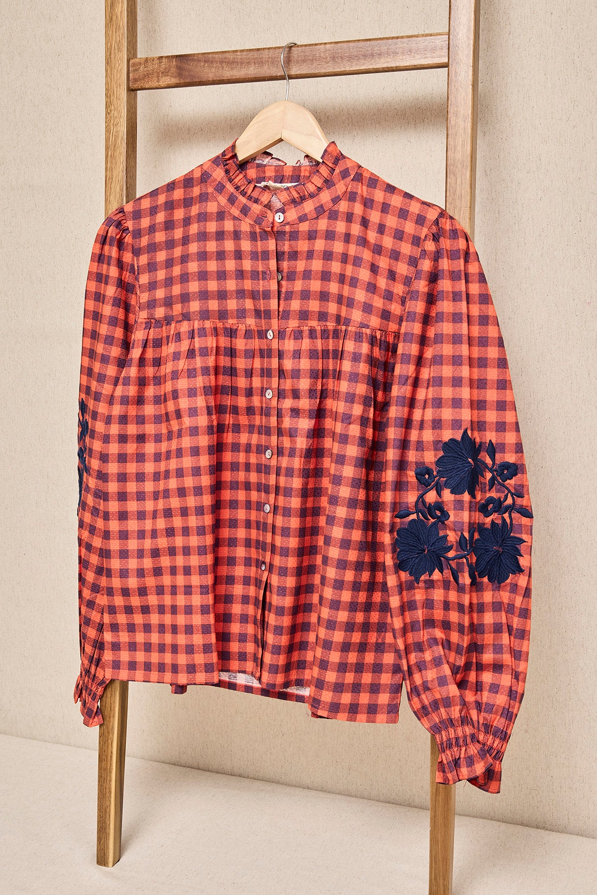 Blusa de viscosa con estampado de cuadros y bordados de hilo en las mangas. Cuenta con un cuello mao fruncido y las mangas abullonadas con puños elásticos. Cierre con botones.