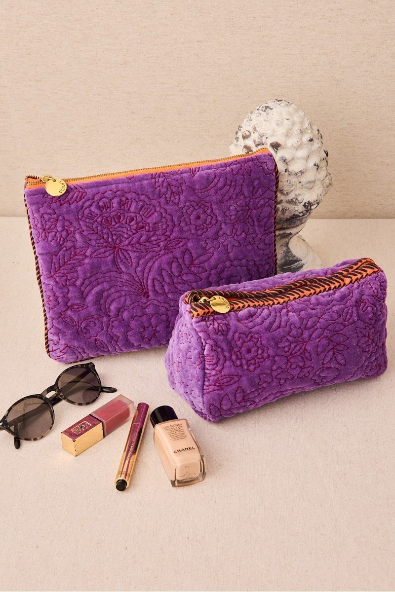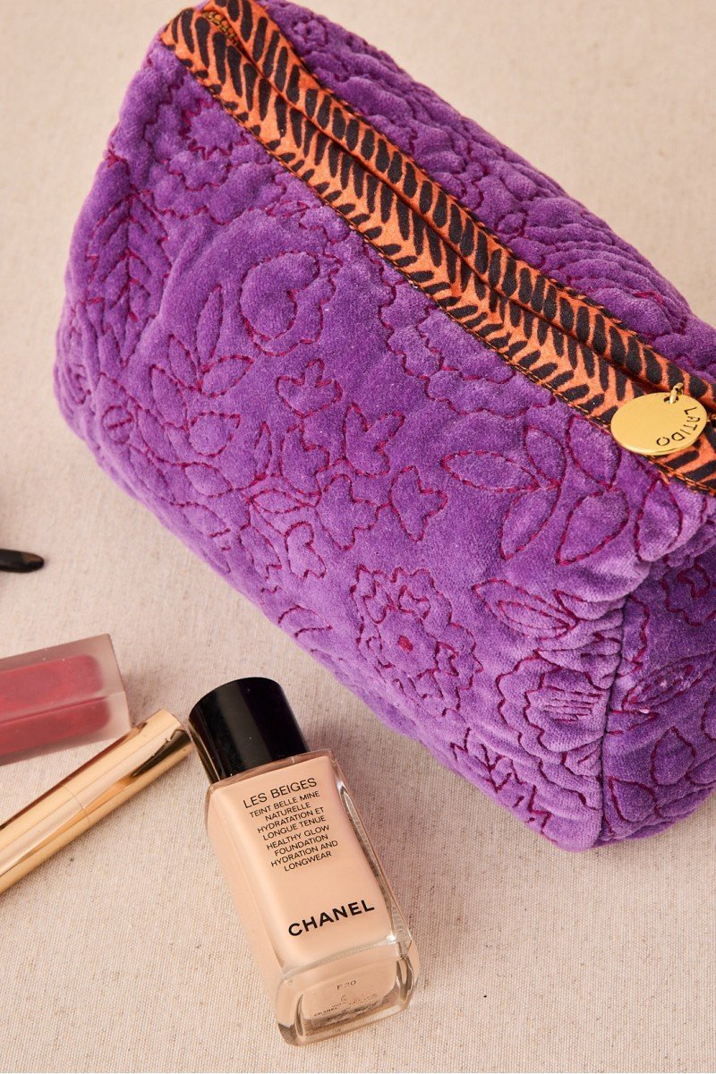 Bolsita mediana de terciopelo con print de rayas en tonos intensos y bordados con hilos que aportan textura y carácter. Perfecta para dar color a tus días de invierno y mantener el orden con estilo.