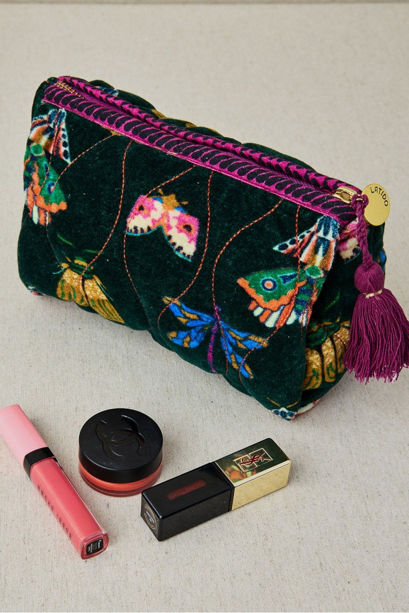 Compacta y con forma ligeramente redondeada, esta bolsita en terciopelo estampado destaca por su textura acolchada y los pespuntes en hilo que dibujan sutiles relieves. Un accesorio práctico y especial para acompañarte a diario.