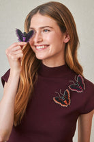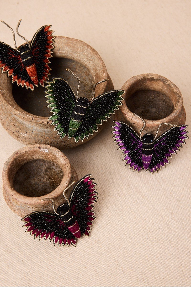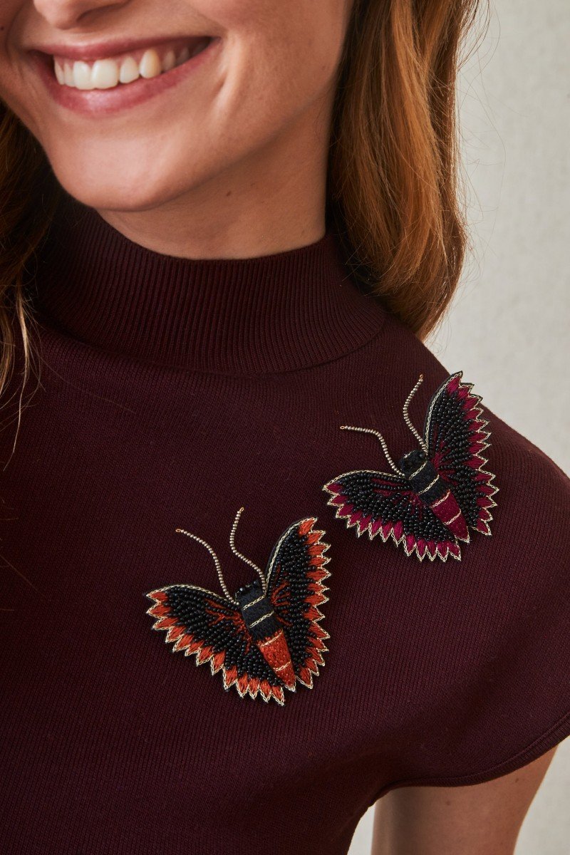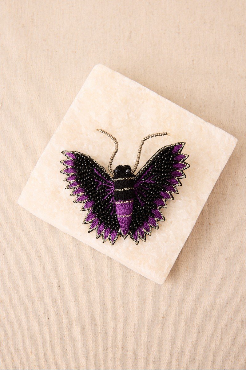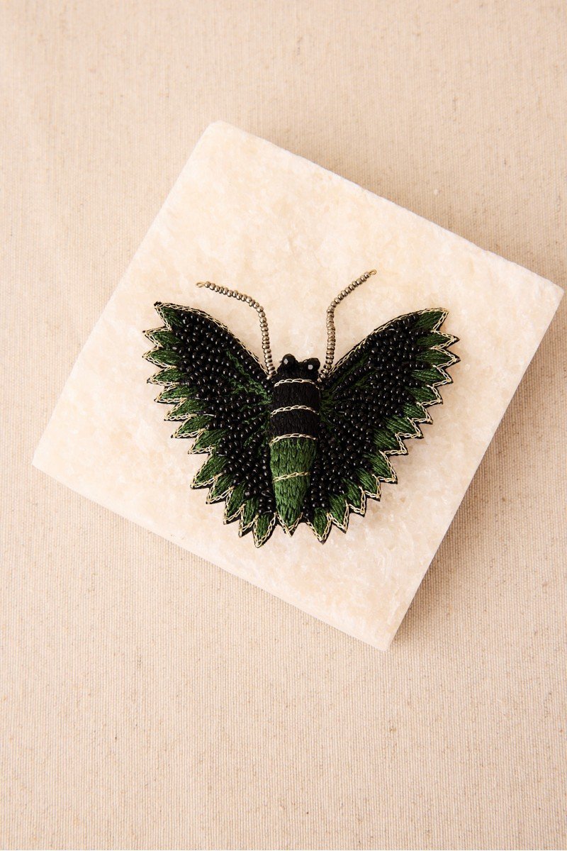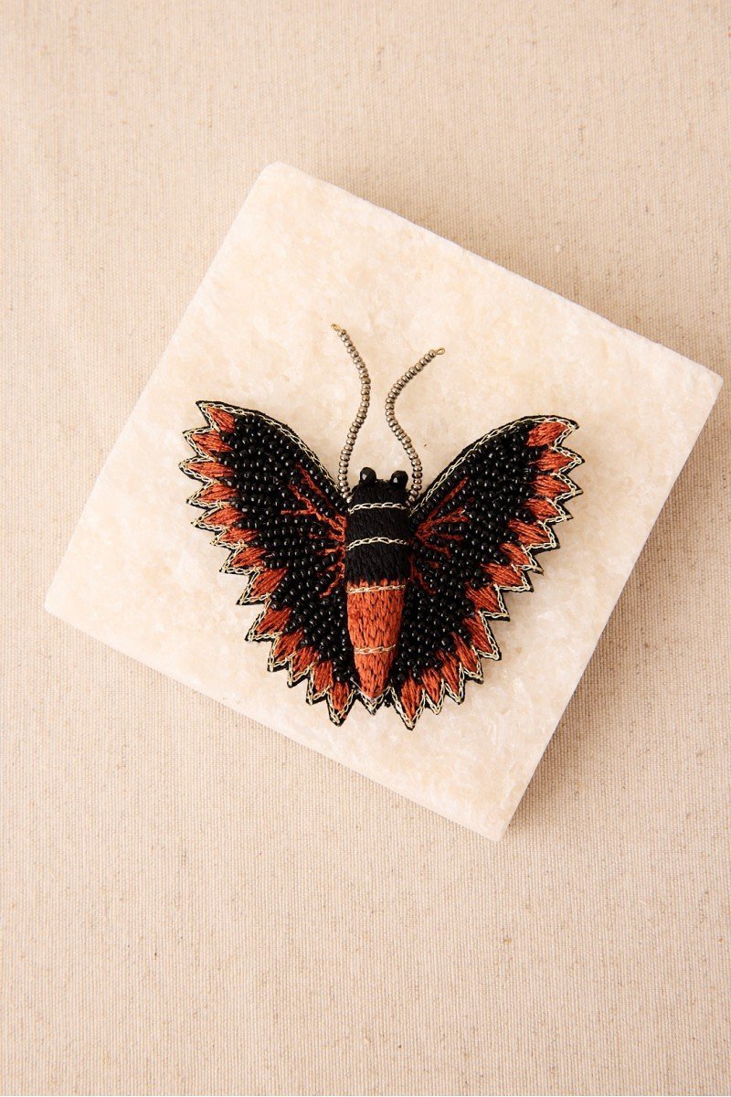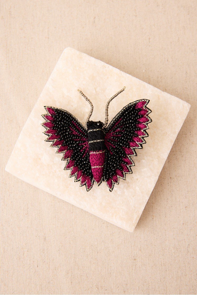 Broche de mariposa con bordado a mano en hilos y cuentas de cristal. Su silueta envolvente y su acabado detallado lo convierten en una pieza llamativa y sofisticada.