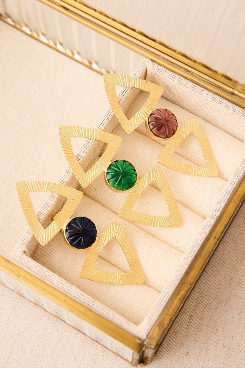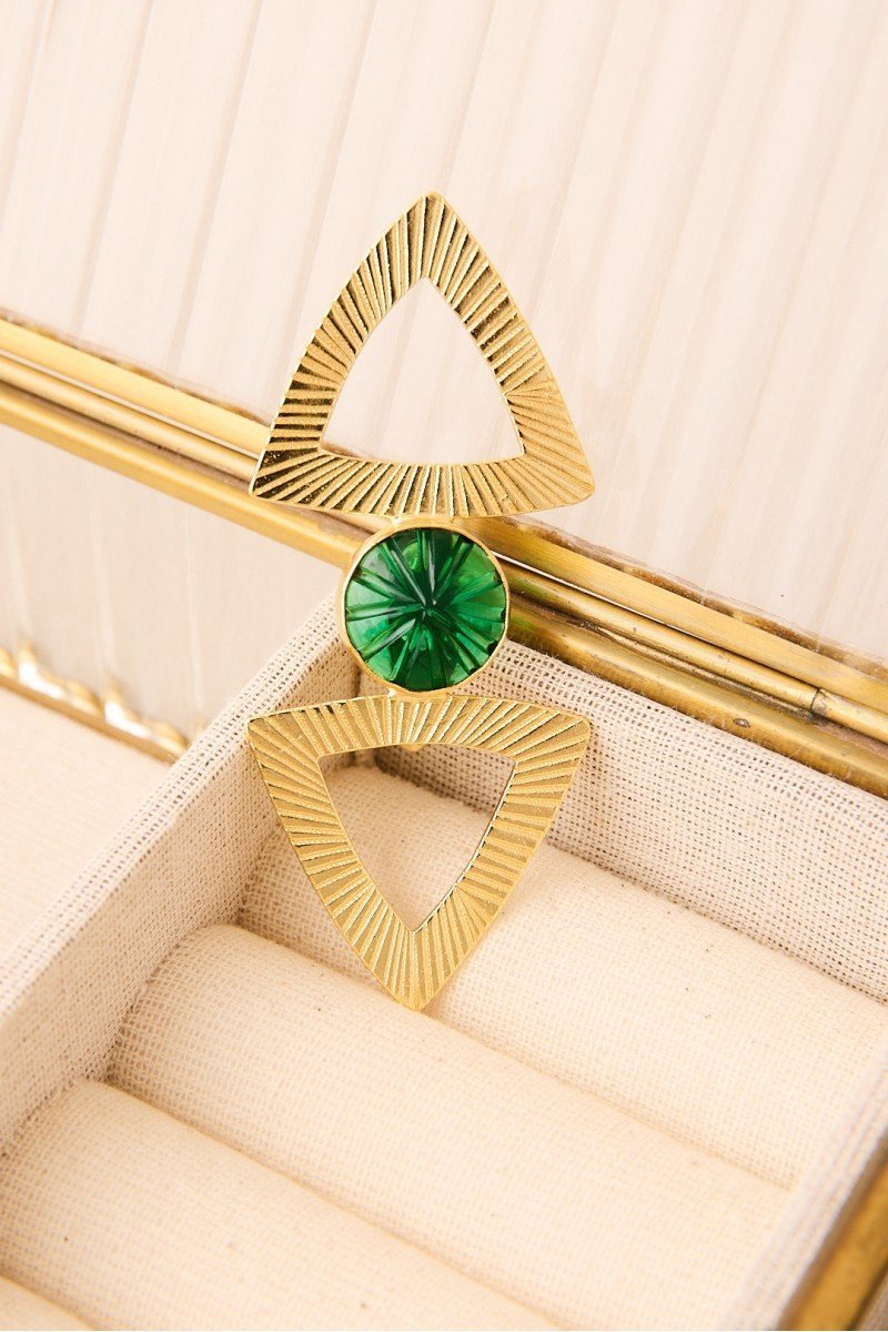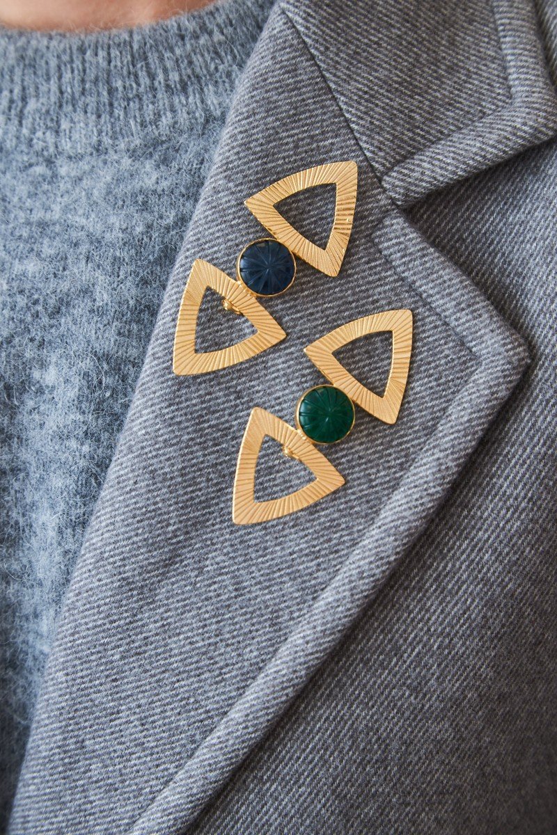 Broche de latón con baño de oro y piedra semipreciosa tallada en el centro. Un diseño estructural y elegante que aporta carácter a cualquier look, ideal para complementar prendas de abrigo o darle un toque especial a tus accesorios