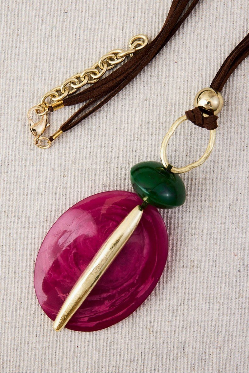 Colgante con formas orgánicas en resina, detalles metálicos bañados en oro y tiras de ante. Una combinación de materiales que crea una pieza con carácter y un punto artístico.