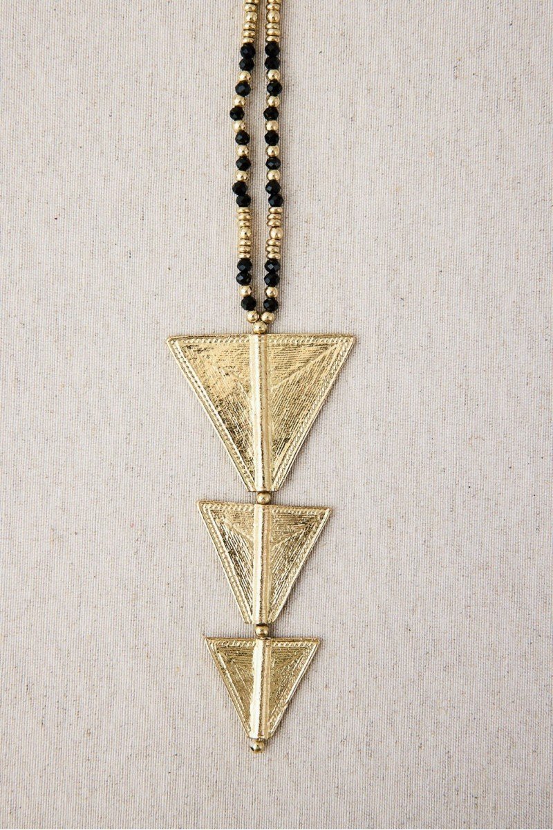 Collar largo con colgante de triángulos superpuestos en latón con baño de oro y cuentas facetadas. Su diseño lineal y su brillo sutil lo convierten en una pieza clave para alargar visualmente el escote.