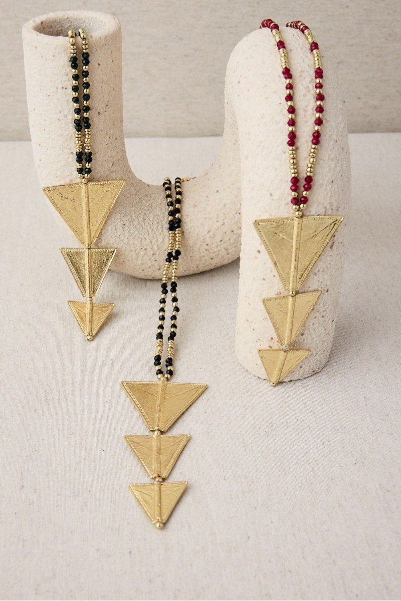 Collar largo con colgante de triángulos superpuestos en latón con baño de oro y cuentas facetadas. Su diseño lineal y su brillo sutil lo convierten en una pieza clave para alargar visualmente el escote.