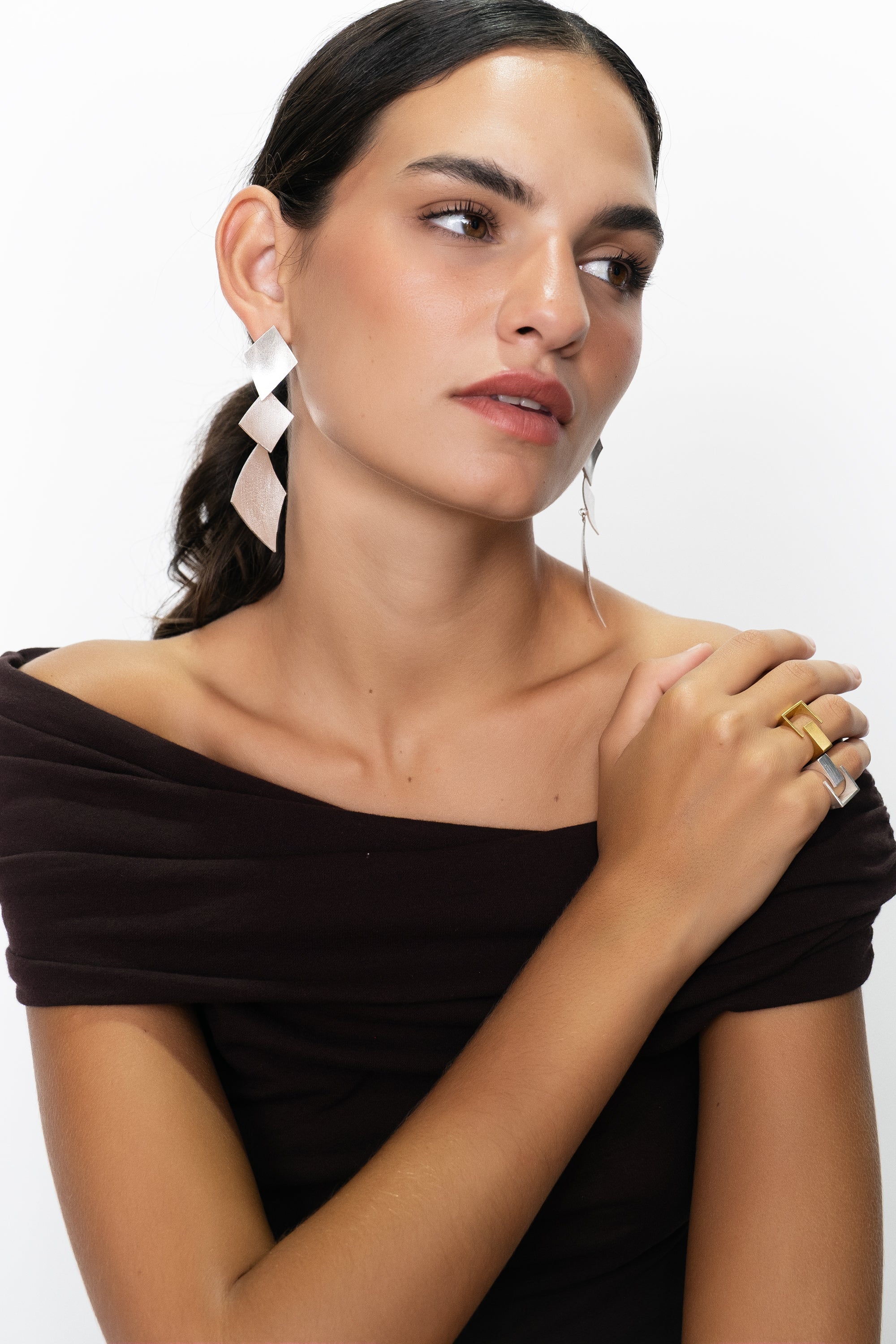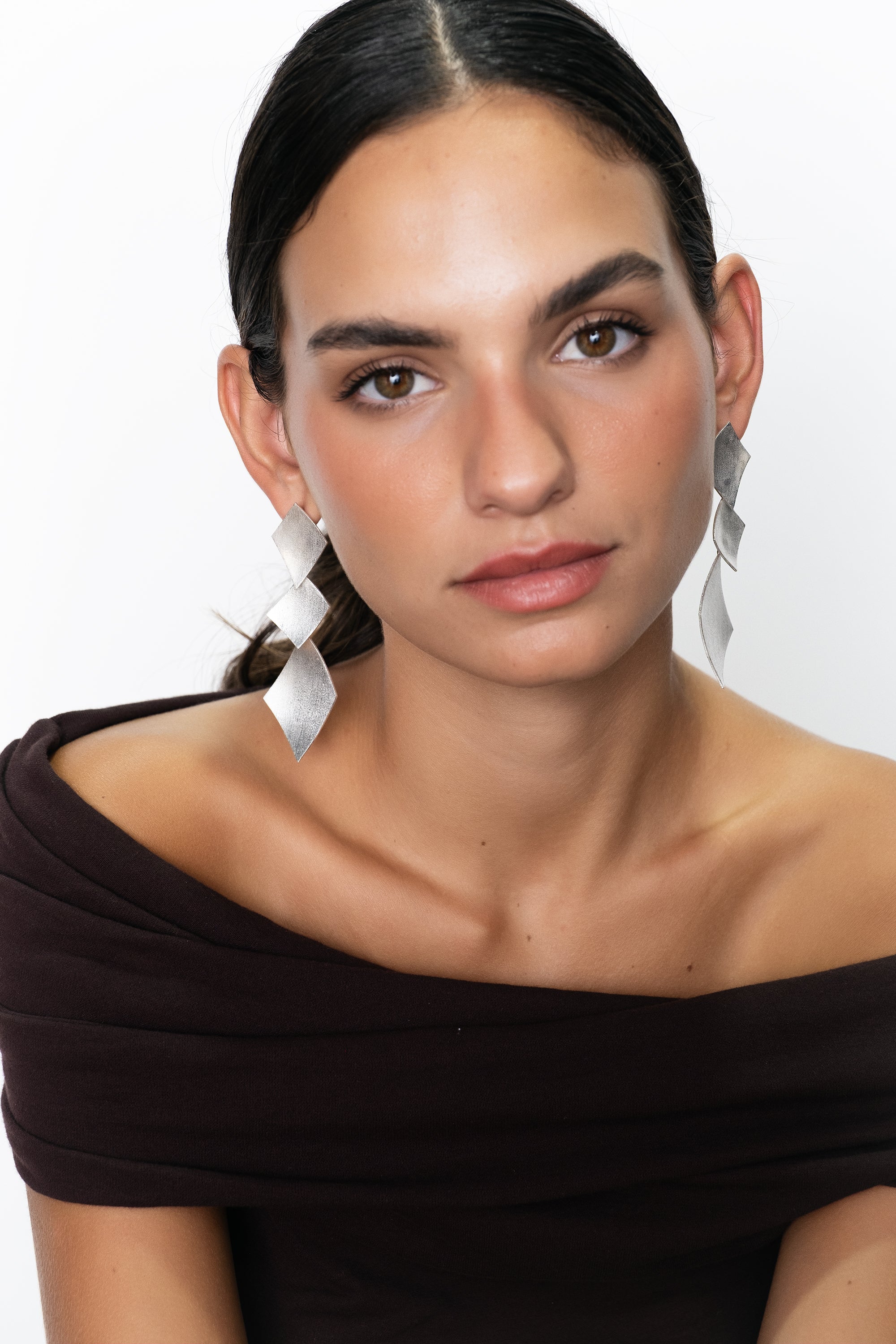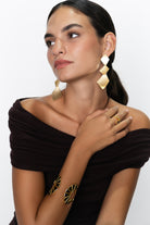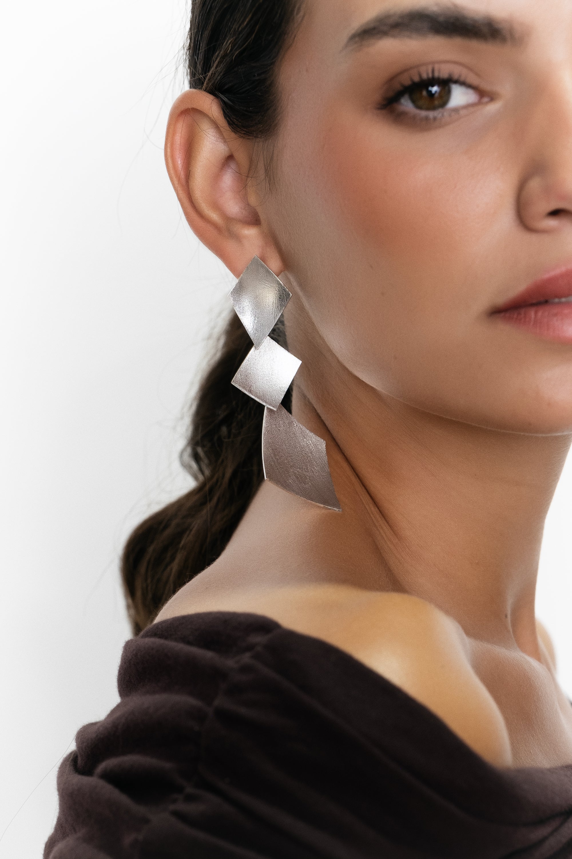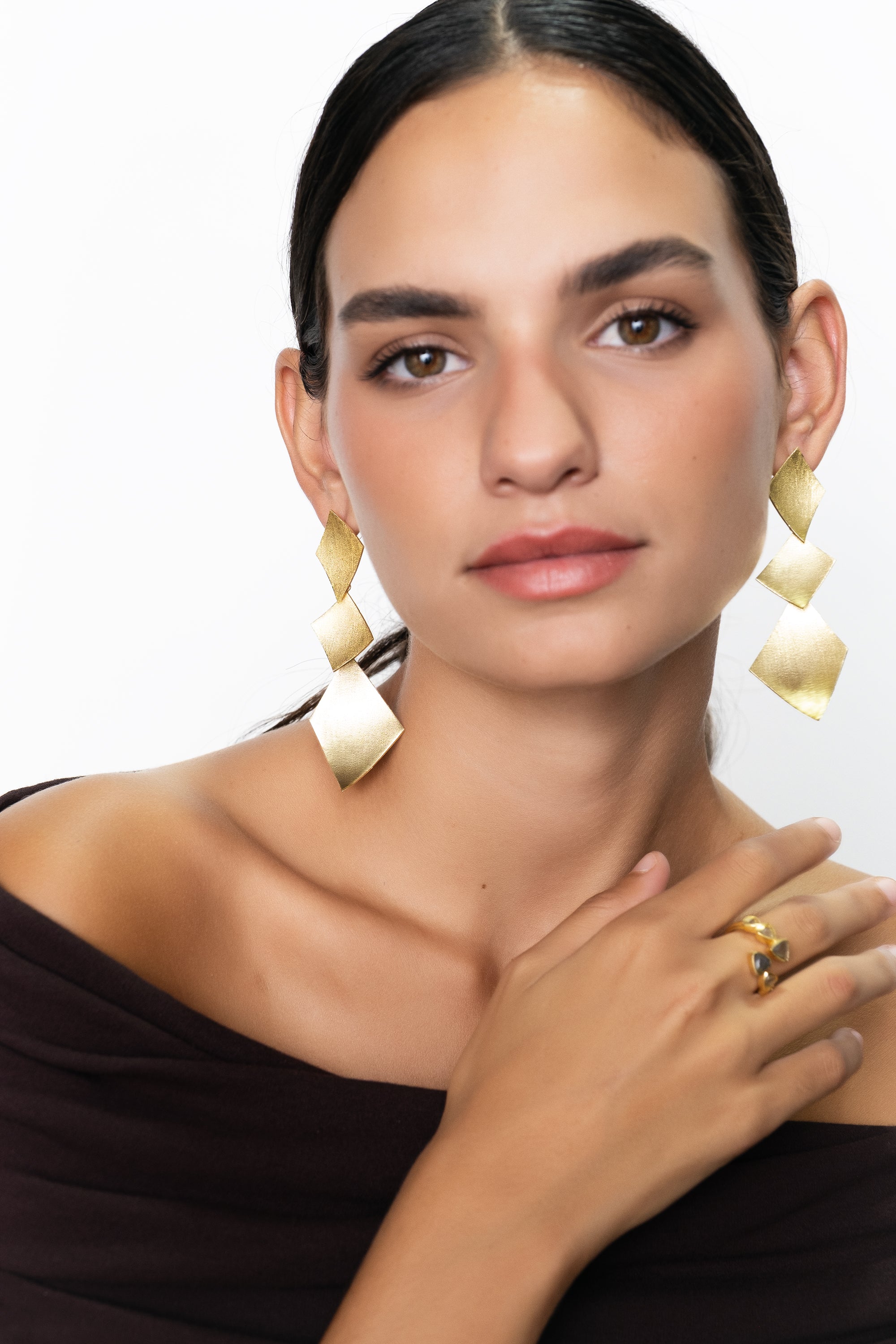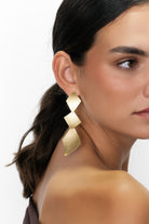 Pendientes atrevidos formados por tres rombos asimétricos, siendo el tercero de mayor tamaño que aporta carácter y personalidad, hechos a mano en latón chapado de acabado mate.