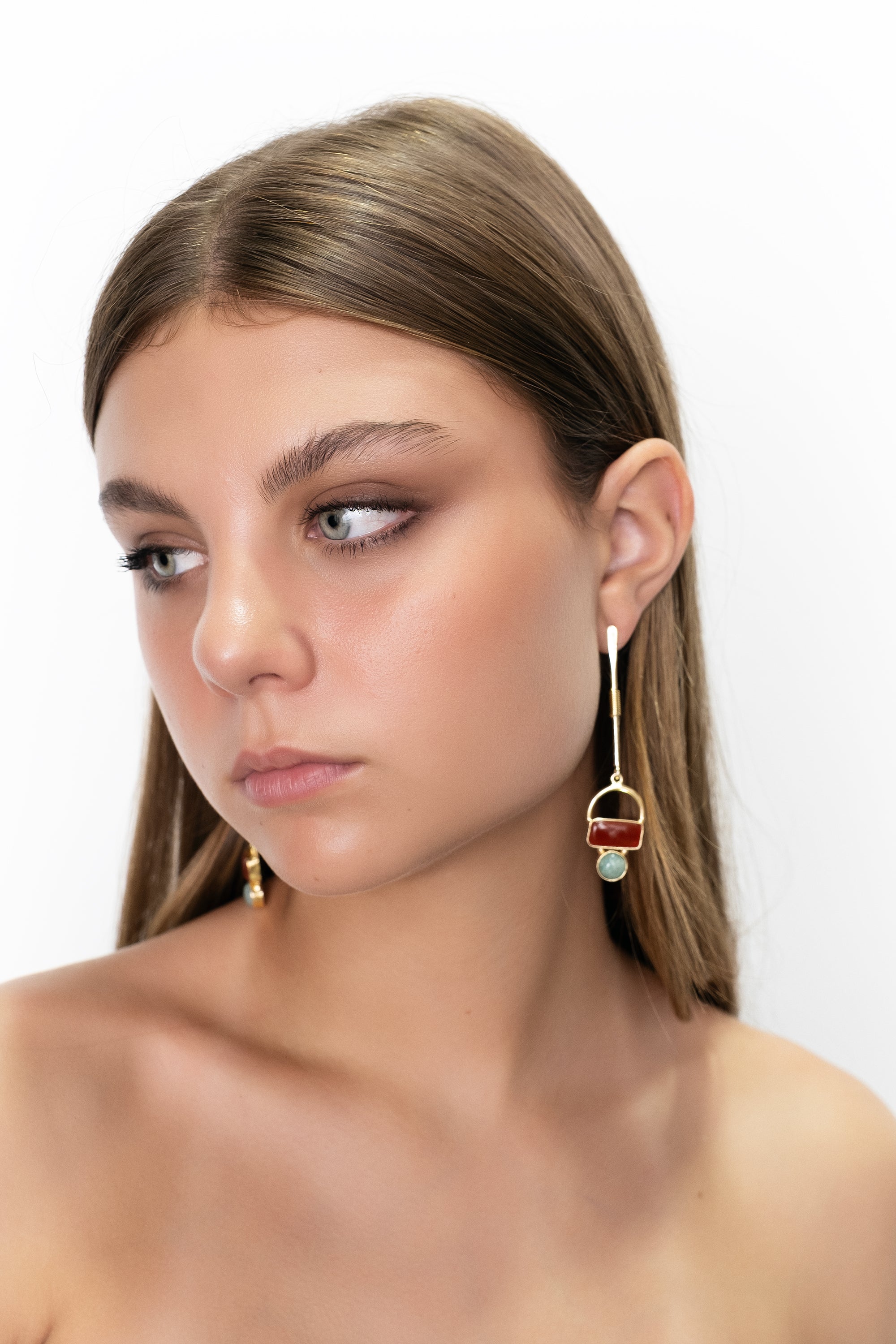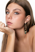 Pendientes largos de latón chapado en oro 22k. Cuelgan de una barra metálica fina que conecta con medio aro del cual le siguen dos piezas, una piedra rectangular y justo debajo, una piedra redonda, ambas enmarcadas en latón chapado en oro.