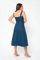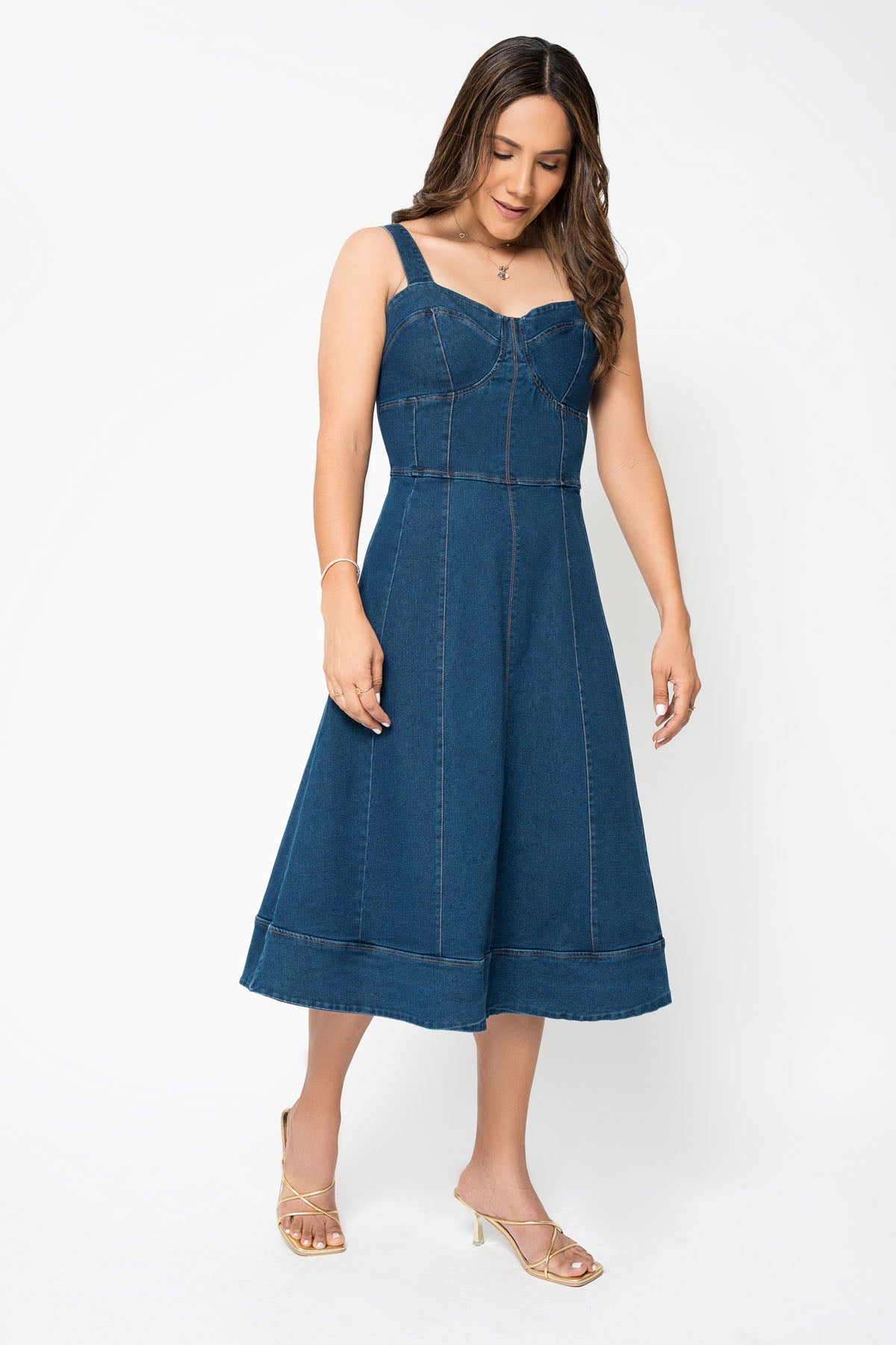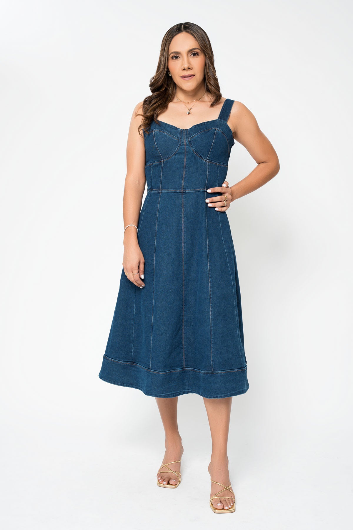 Vestido diseñado en tela índigo con stretch, su tejido contiene fibras elásticas y se caracteriza por su capacidad de adaptarse al cuerpo, ofreciendo comodidad y flexibilidad. Diseño con corte amplio, ajusta hasta la cintura, teminando en A. Esto permite una mayor libertad de movimiento y una sensación relajada al vestirlo. La modelo