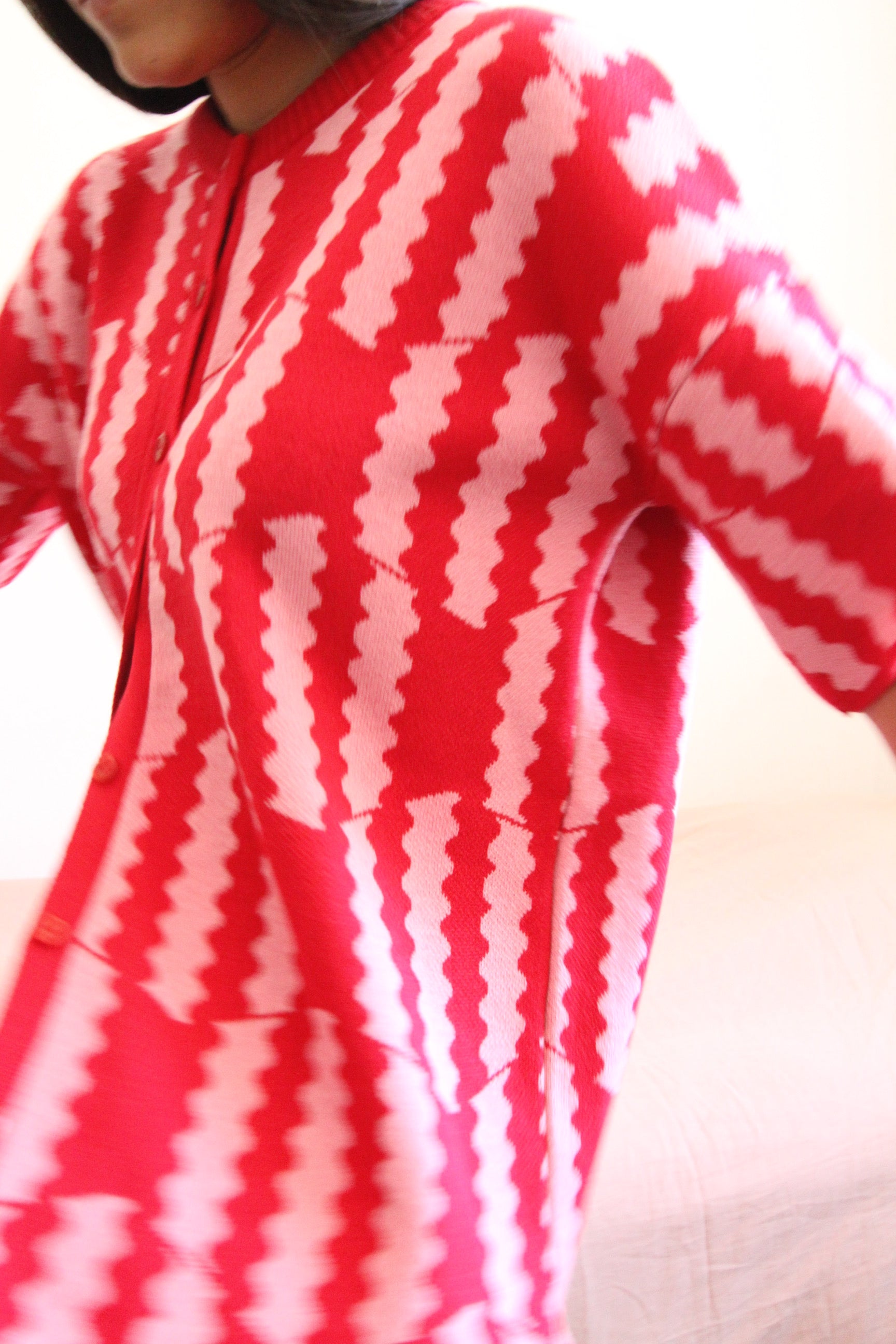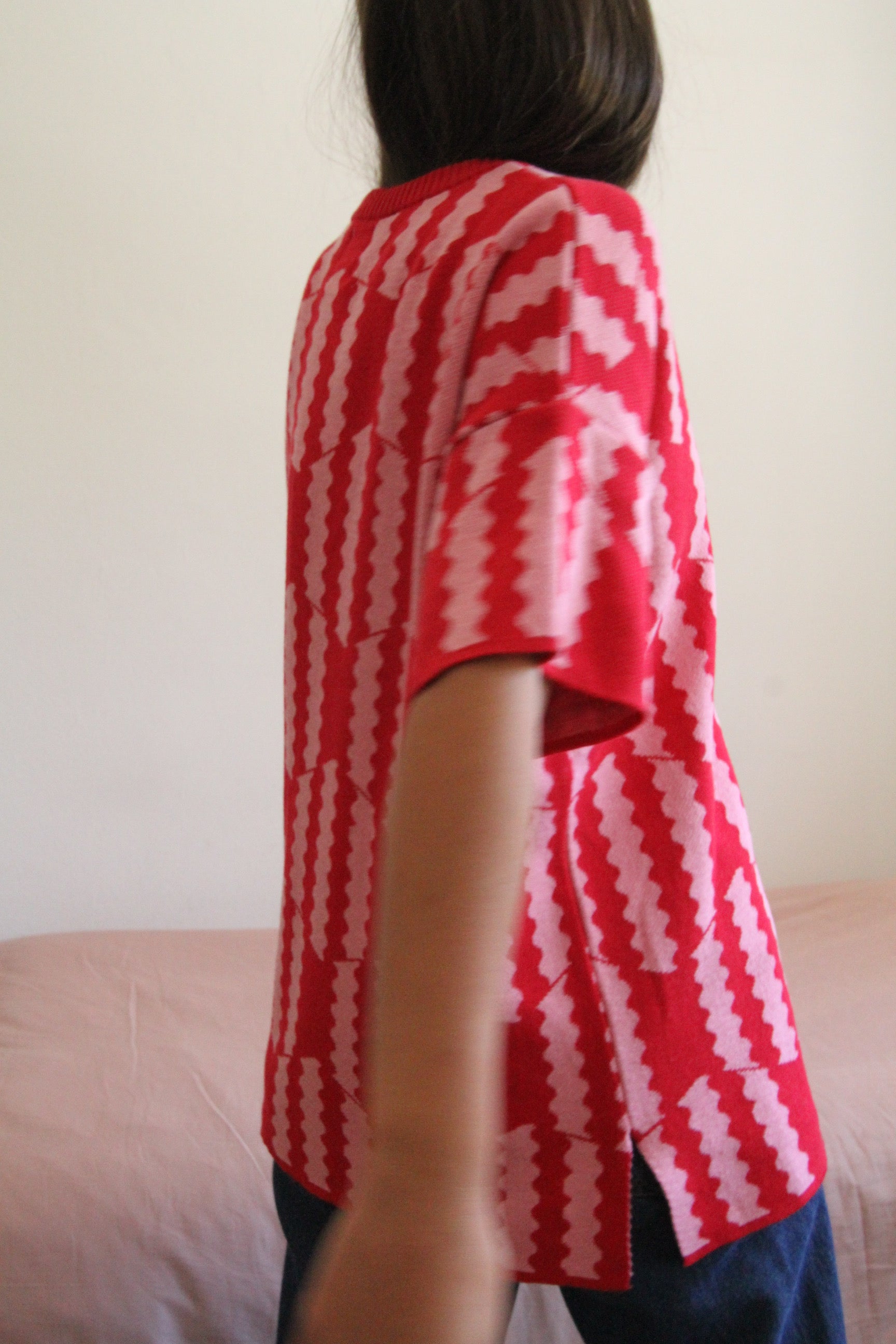 Short sleeve shirt with eight buttons at the front and cuts on each side, jacquard knitting