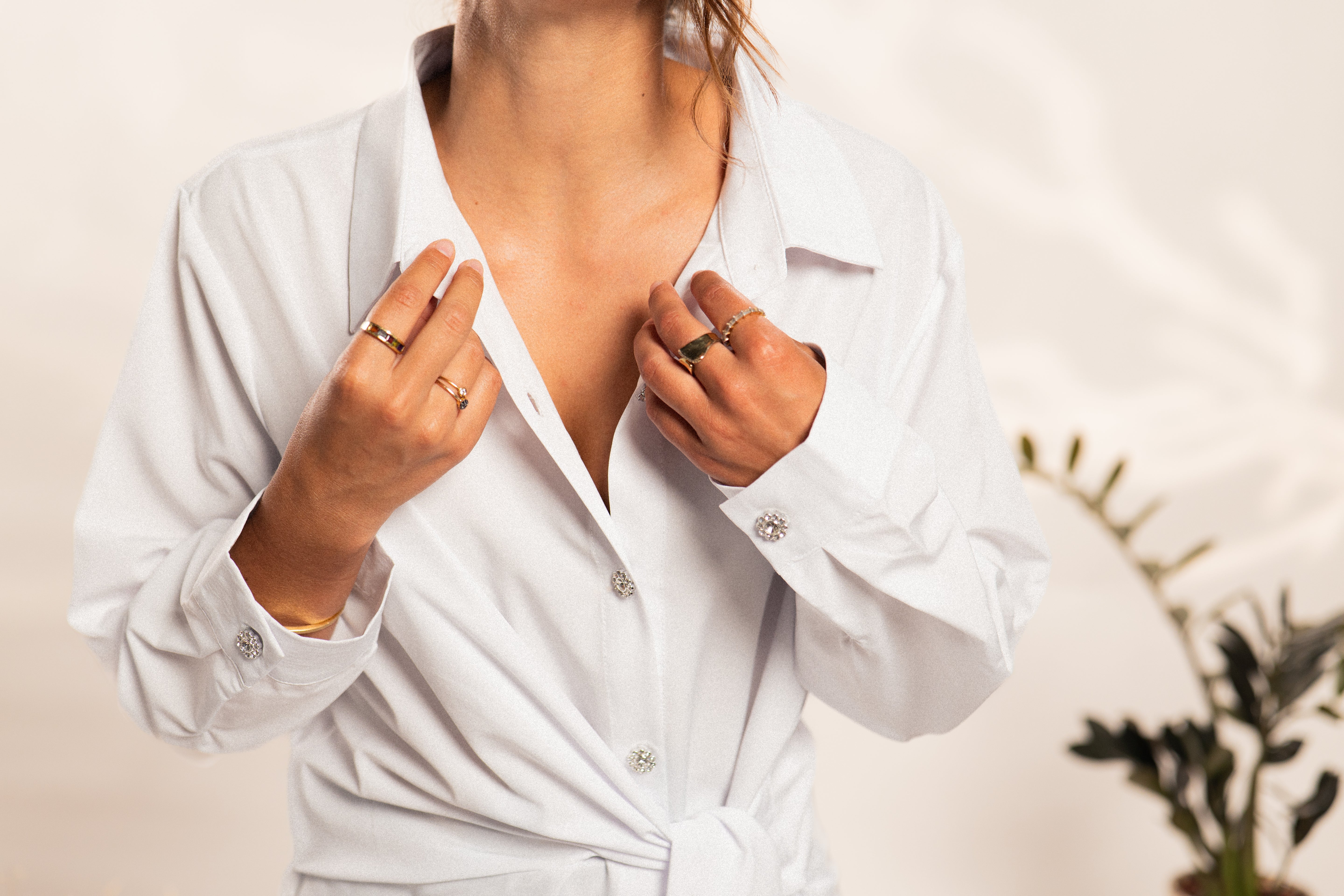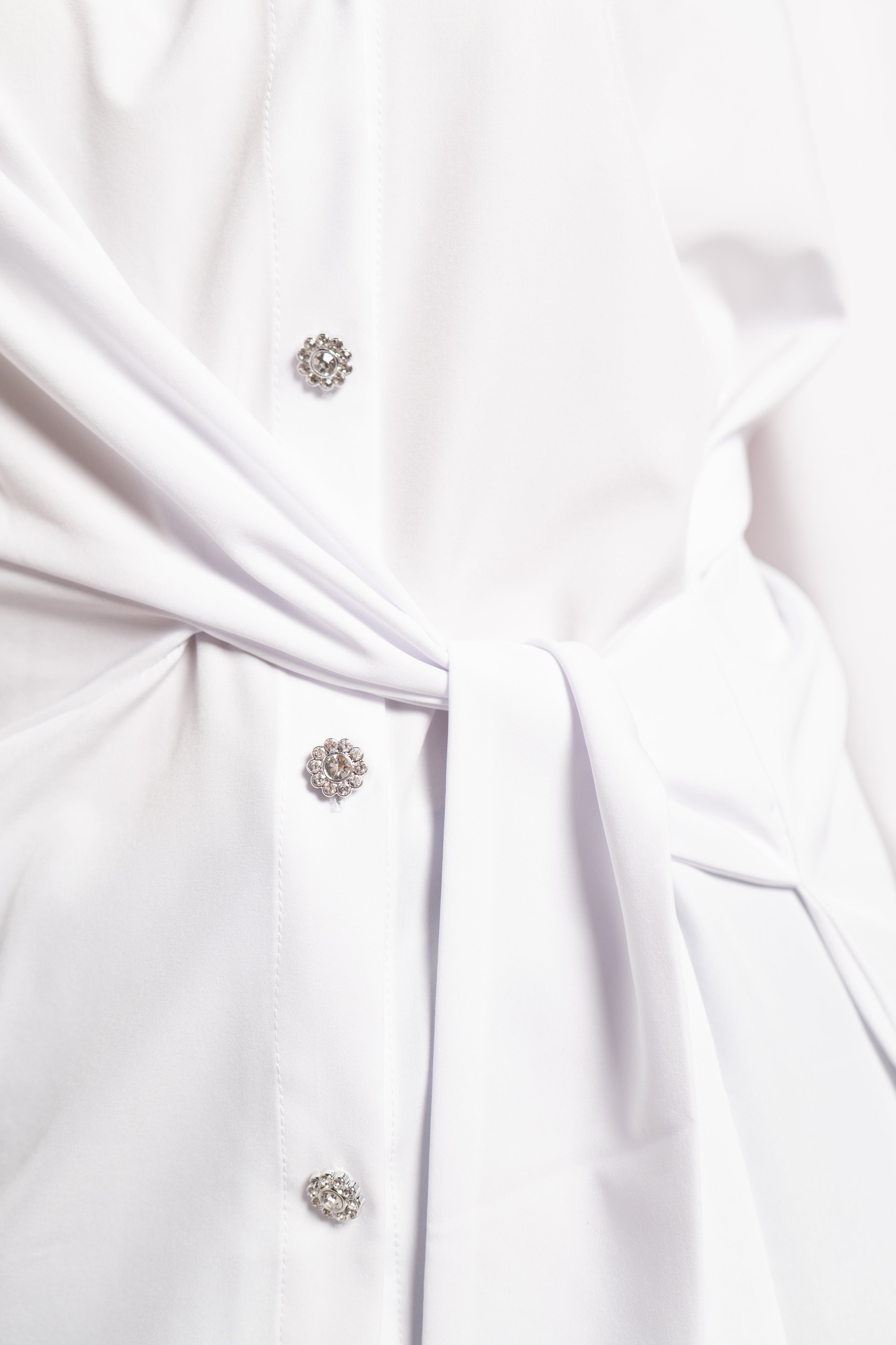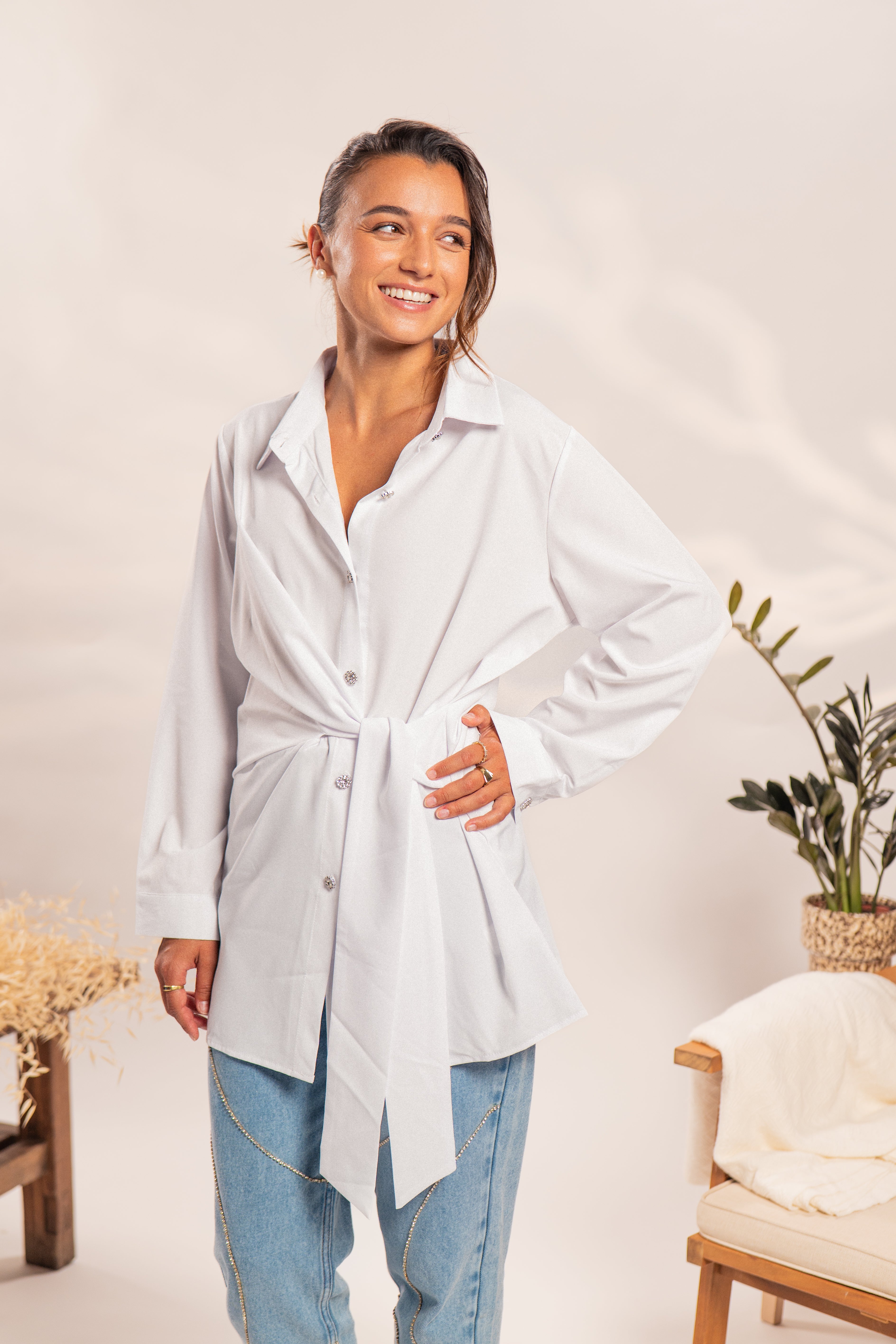 Camisa blanca de corte largo, con una caída que sobre pasa sutilmente la cadera, brindando un aire moderno y relajado. Confeccionada con manga larga y cuello clásico, presenta una hilera frontal de botones con acabado metálico y brillos sutiles, añaden un toque de luz y sofisticación al diseño. El detalle distintivo son sus tiras ajustables al frente, permiten crear un amarre favorecedor, aportando un toque femenino y versátil, ideal para distintos estilismos.