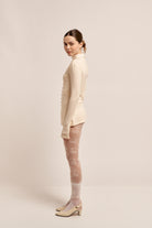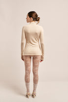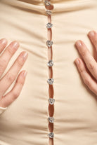 Camiseta de algodón 100% con doble tela frontal para mayor estructura y cero transparencias. Fit al cuerpo con mangas largas que se abren sutilmente al final para estilizar la silueta. Escote cerrado y botones con strass aplicados a mano. Brilla sutil, pero deja huella.