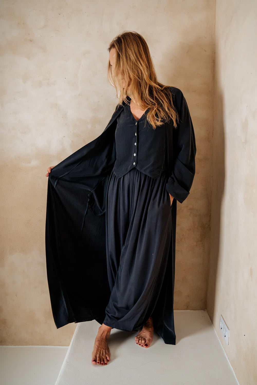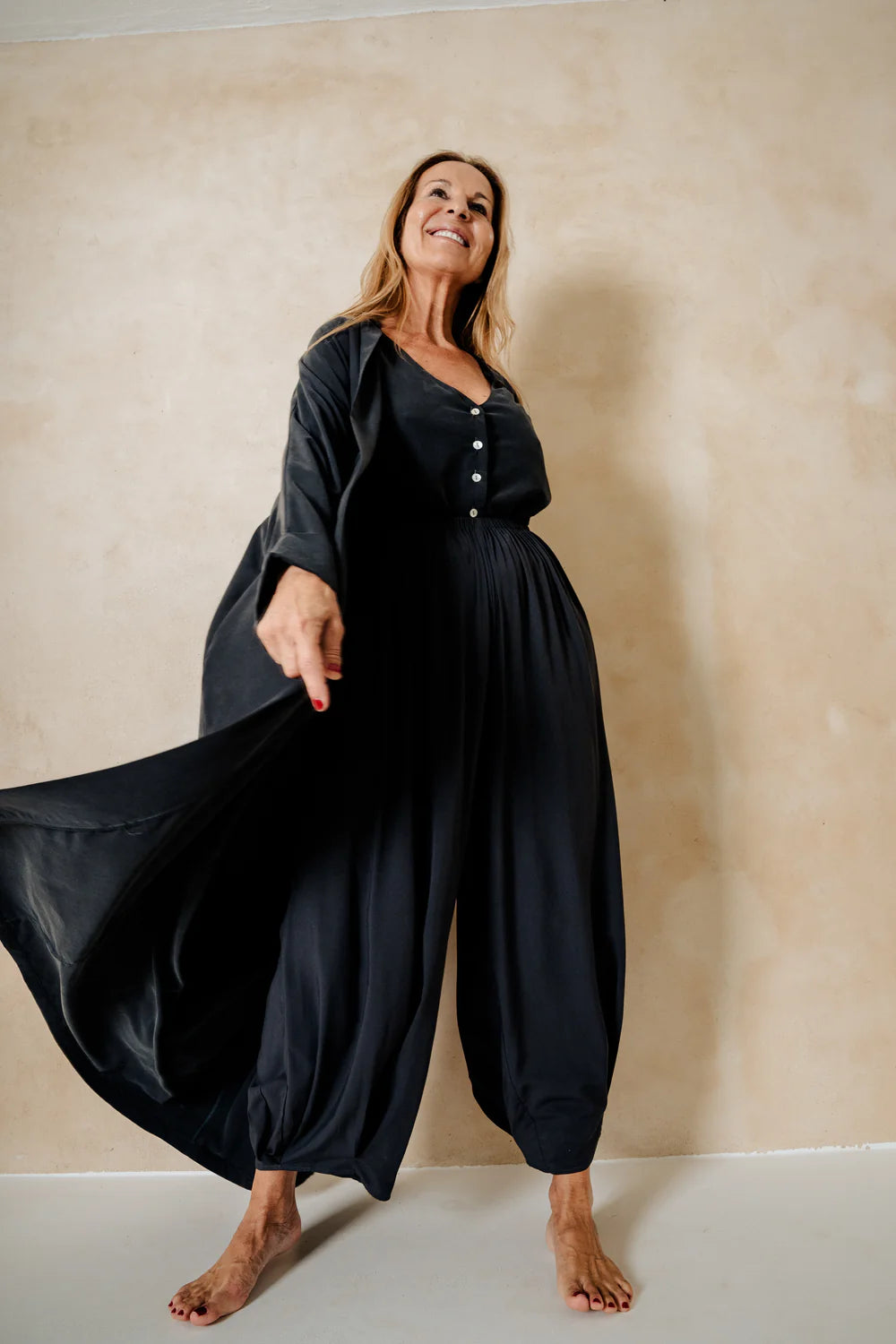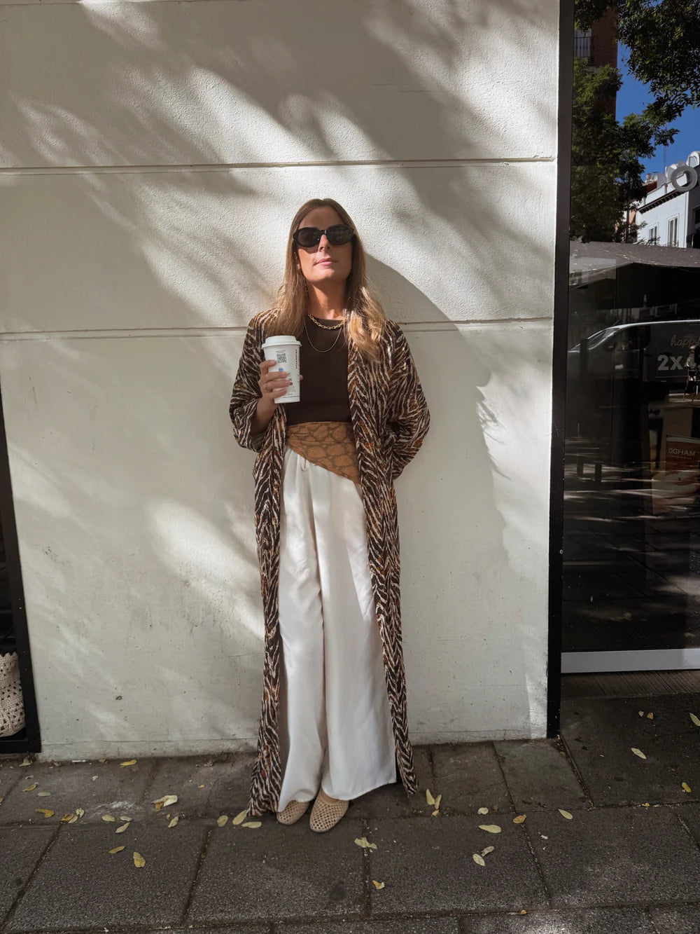 Chaqueta fluida y larga, diseñada en un tejido modal 100% suave y elegante es perfecta para completar tus looks. La chaqueta Cloe es una prenda versátil y atemporal, diseñada para superponerse con elegancia sobre pantalones, cuerpos, vestidos o faldas y tops. También conocida como casaca o guardapolvos, está confeccionada en un tejido suave y ligero que permite un movimiento fluido, estilizando la silueta de quien la lleva. Su diseño sofisticado la convierte en una elección ideal para diversas ocasiones, aportando un toque de distinción y modernidad a cualquier atuendo. Materiales: Cloe está confeccionada 100% en TENCEL/Modal , es una fibra proveniente de madera cosechada de manera consciente y sustentable. Es un un material suave y transpirable que es conocido por su durabilidad y resistencia a encogerse.