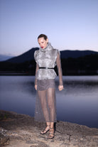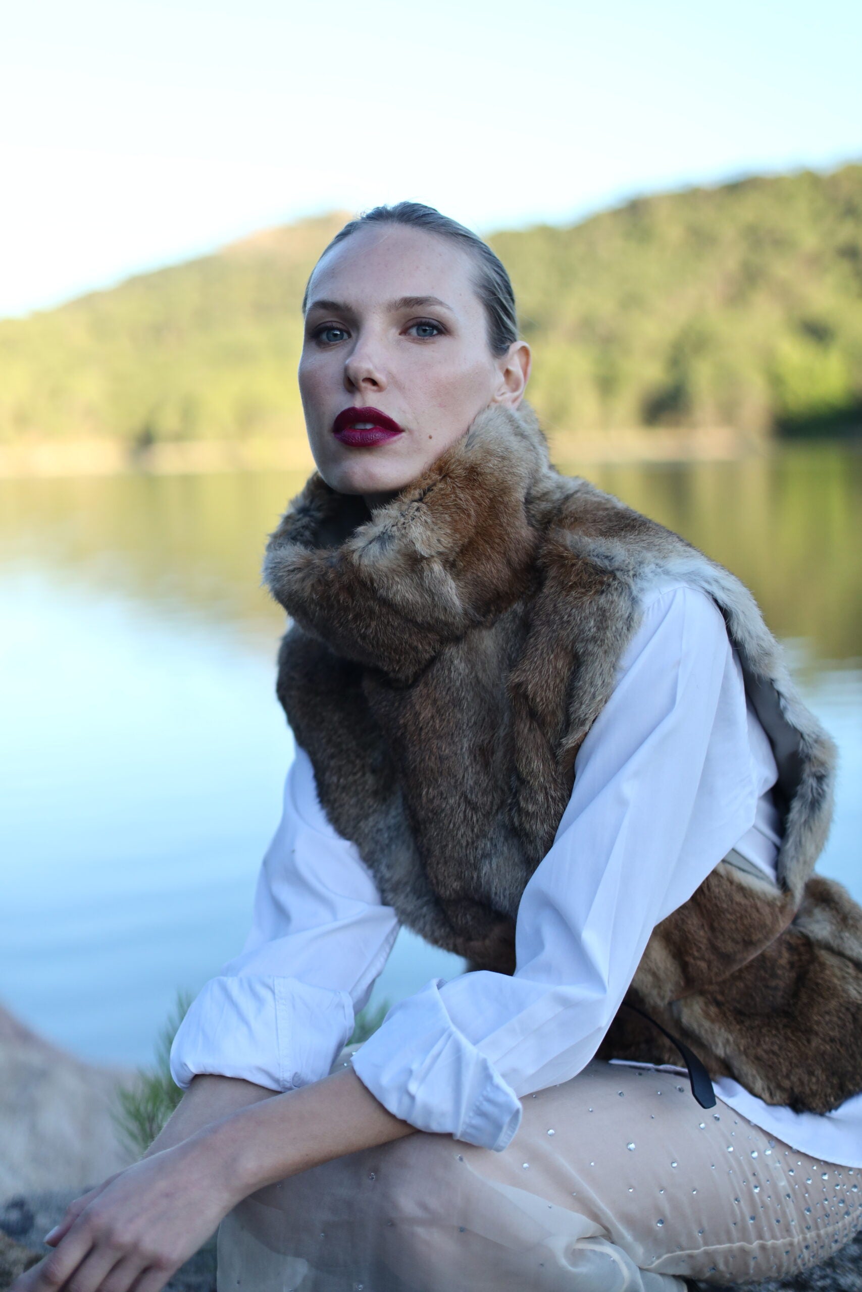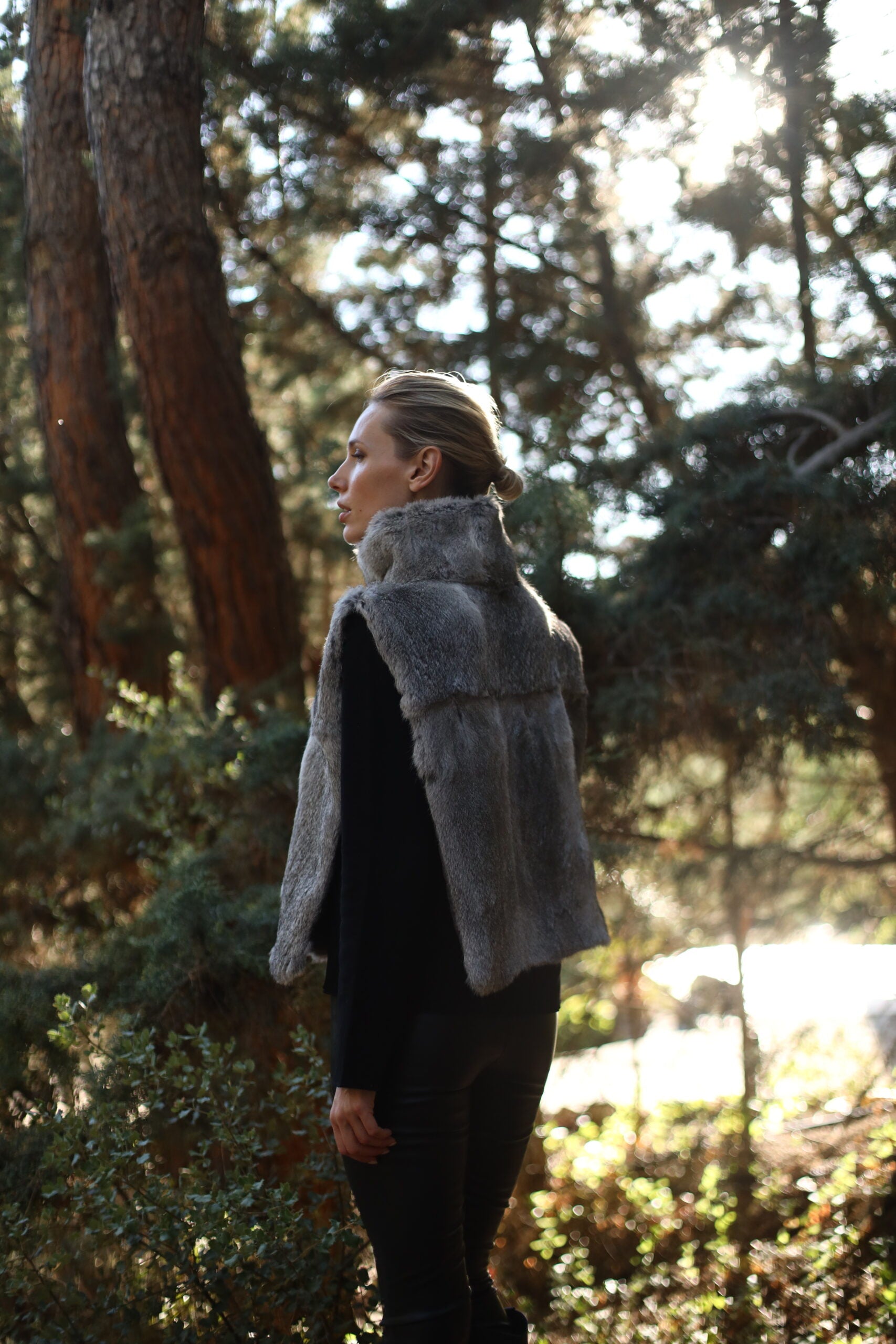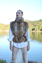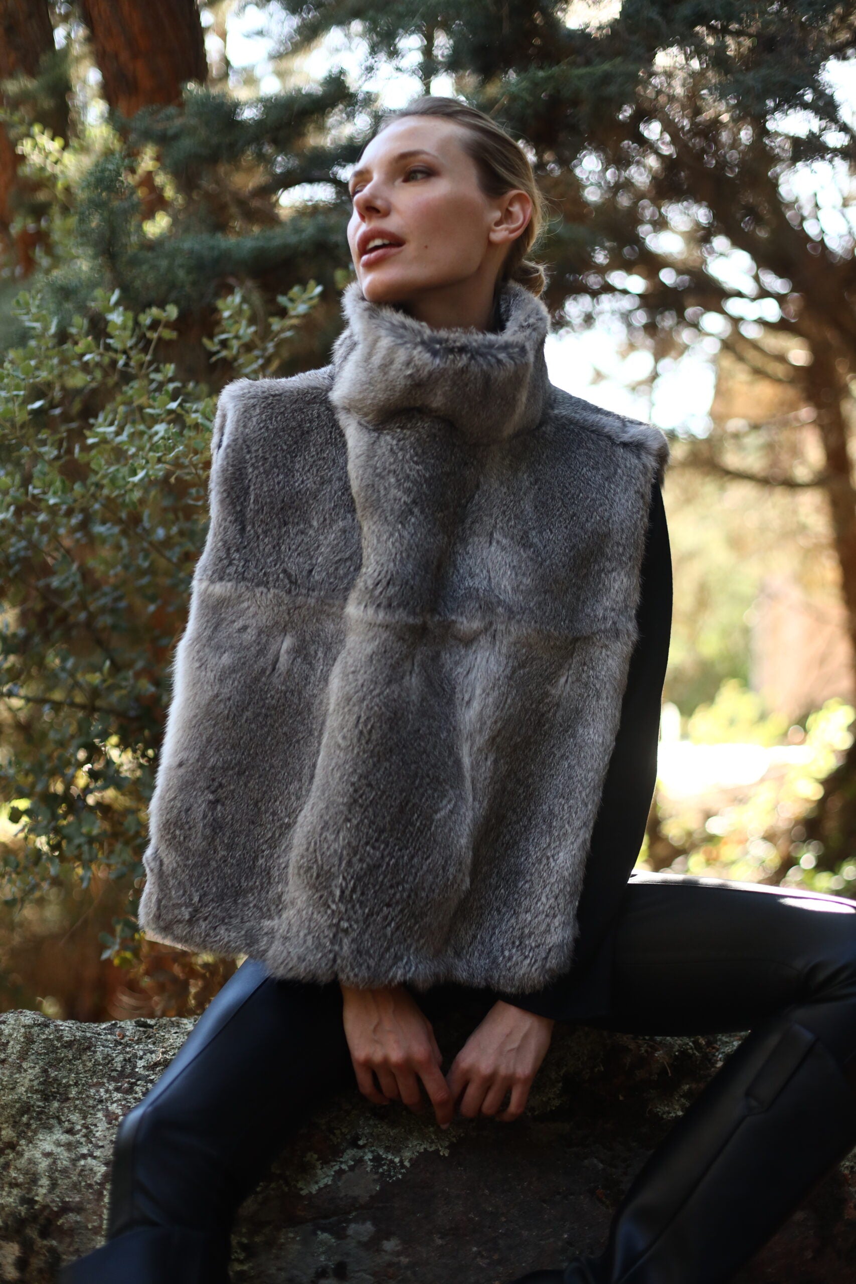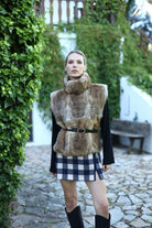 Elegante y versátil chaleco de piel de conejo con cuello alto, diseñado para aportar calidez y estilo. Su diseño abierto por los laterales permite un ajuste cómodo y fluido, con la opción de cerrarlo con un cinturón para un look más estructurado.