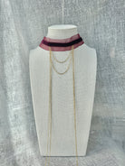 Choker de terciopelo burdeos con base de organza con cadenas finas doradas de acero inoxidable