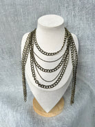 Collar de estilo barroco, diseñado con una sofisticada combinación de cadenas de oro viejo que capturan la esencia del lujo y la elegancia clásica. El diseño se caracteriza por su opulencia y detalles intrincados, ideal para quienes buscan un accesorio que aporte un toque de distinción y un aire vintage a su look. Perfecto para eventos especiales o para resaltar cualquier atuendo con un estilo único y refinado.