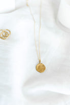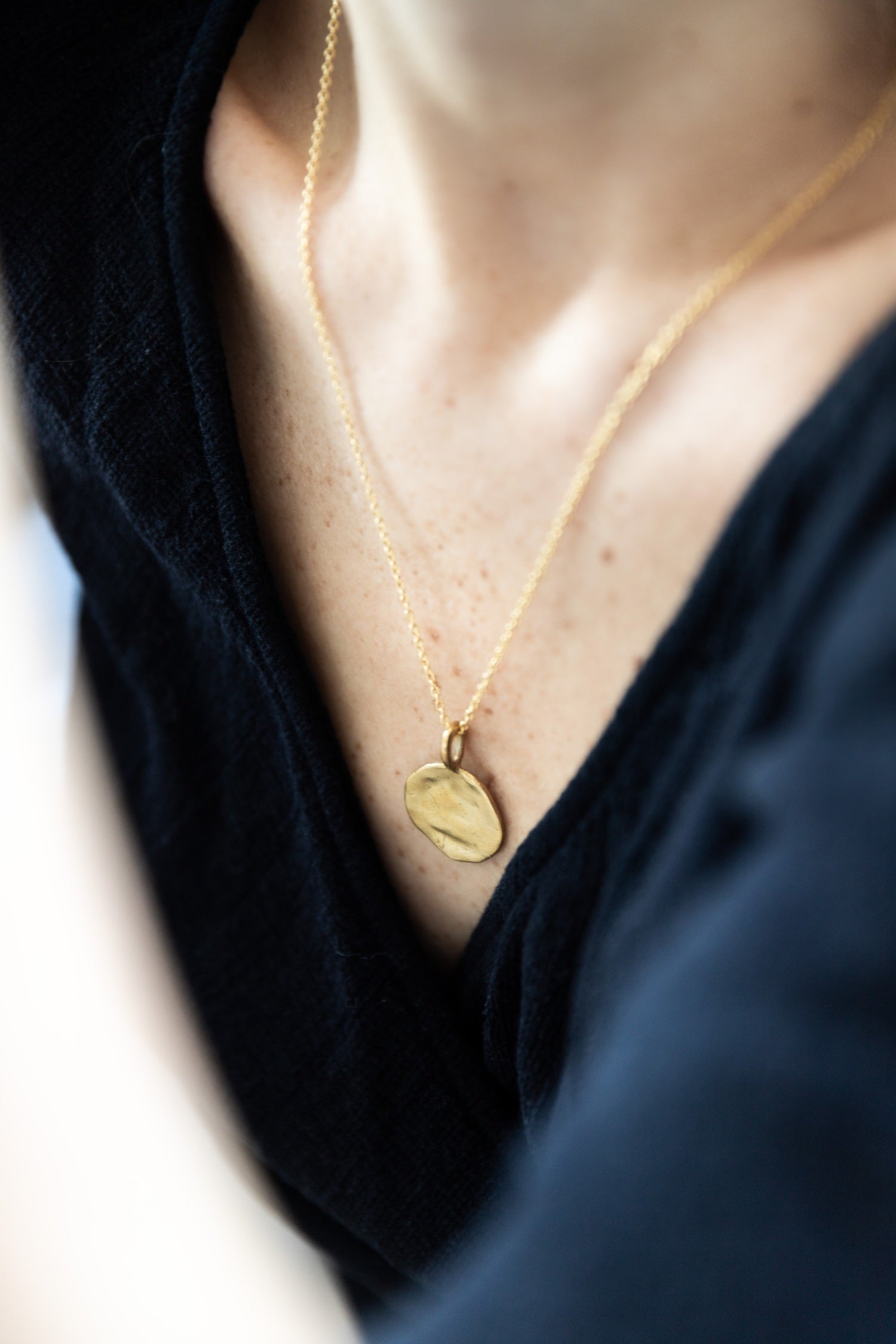 Este colgante de bronce presenta un diseño único de moneda irregular, con un acabado envejecido que le da un toque vintage y sofisticado.
