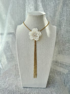 Collar de acero inoxidable con flor blanca con piedrecitas de cristal y cascada de finas cadenas de doradas