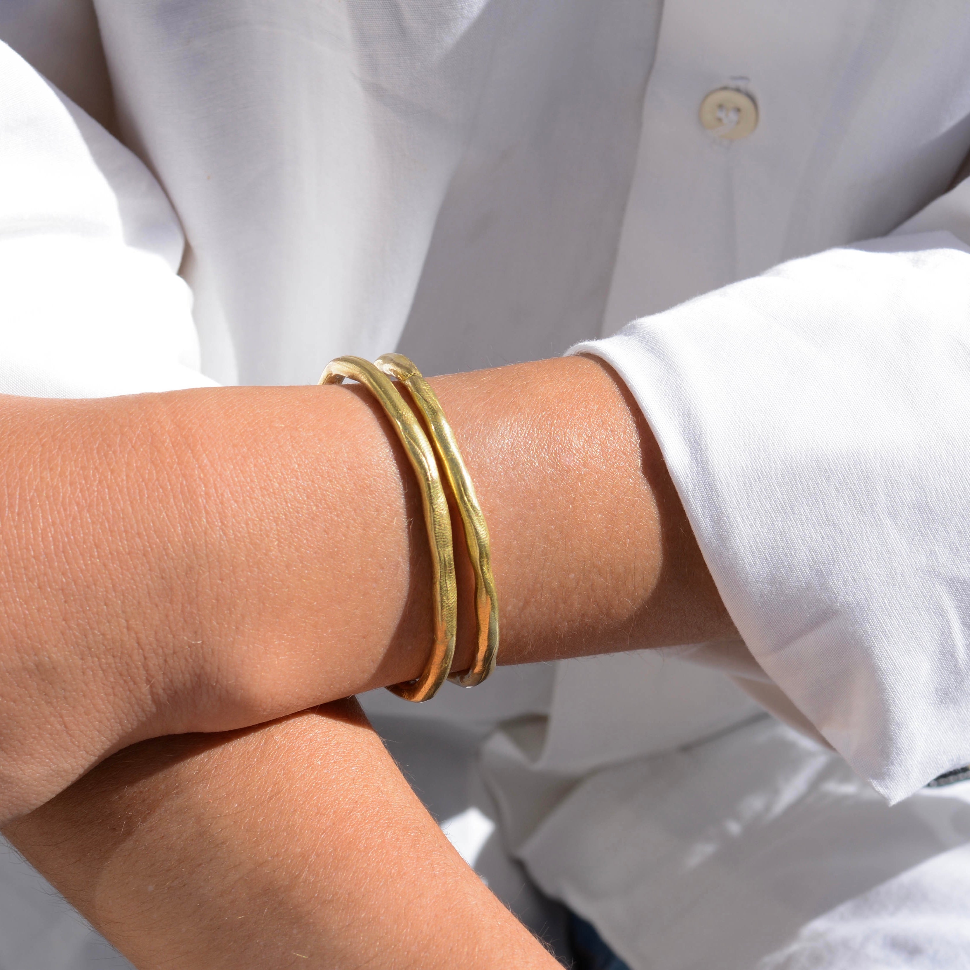 Las Esclavas Irregulares son una declaración de estilo audaz y único. Su diseño moderno y asimétrico las convierte en una pieza versátil que puede ser utilizada sola para un look impactante o combinada con otras pulseras. Hechas de bronce de alta calidad, estas esclavas presentan un acabado que realza la textura irregular y orgánica del diseño, añadiendo un toque contemporáneo y sofisticado a cualquier atuendo.