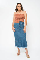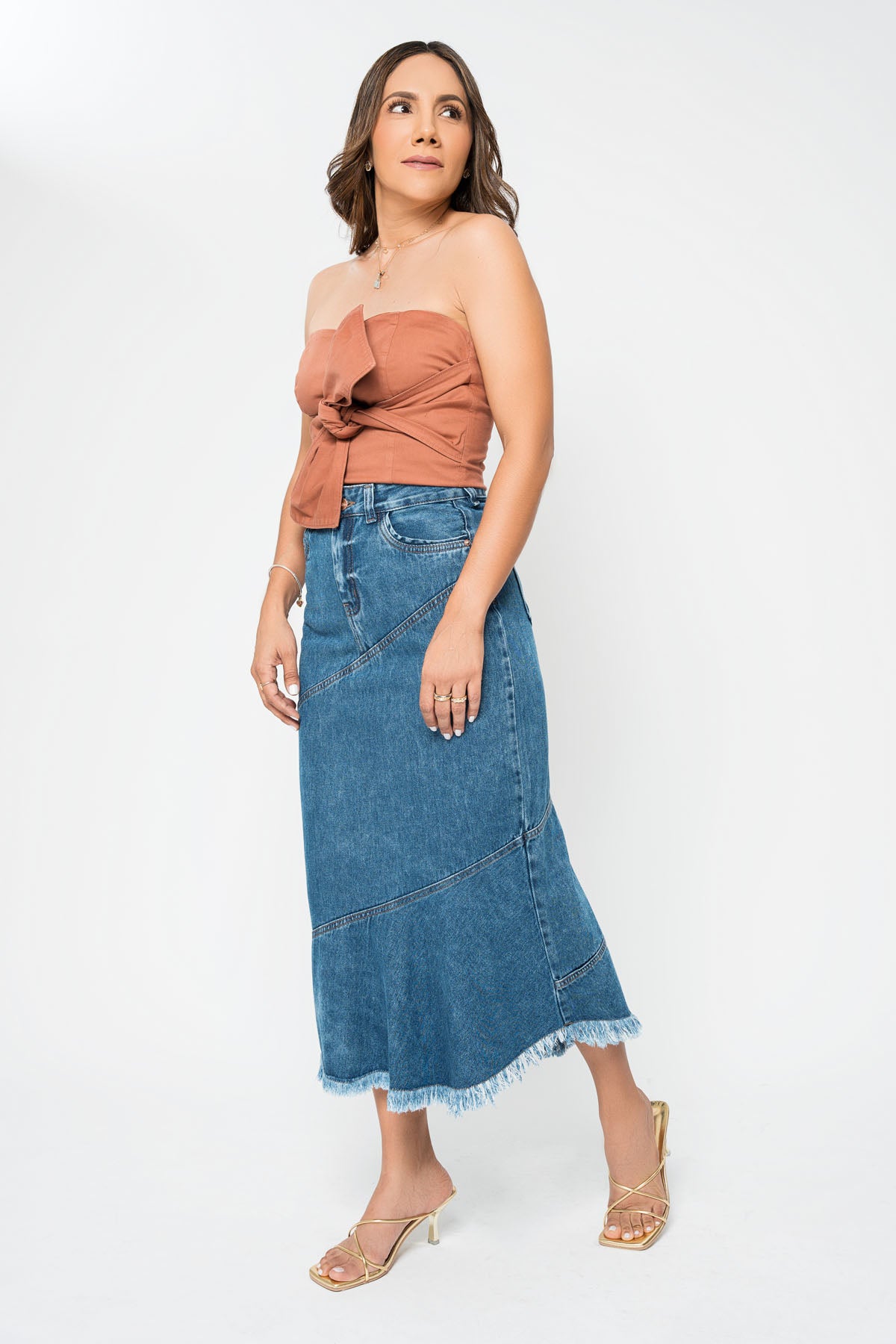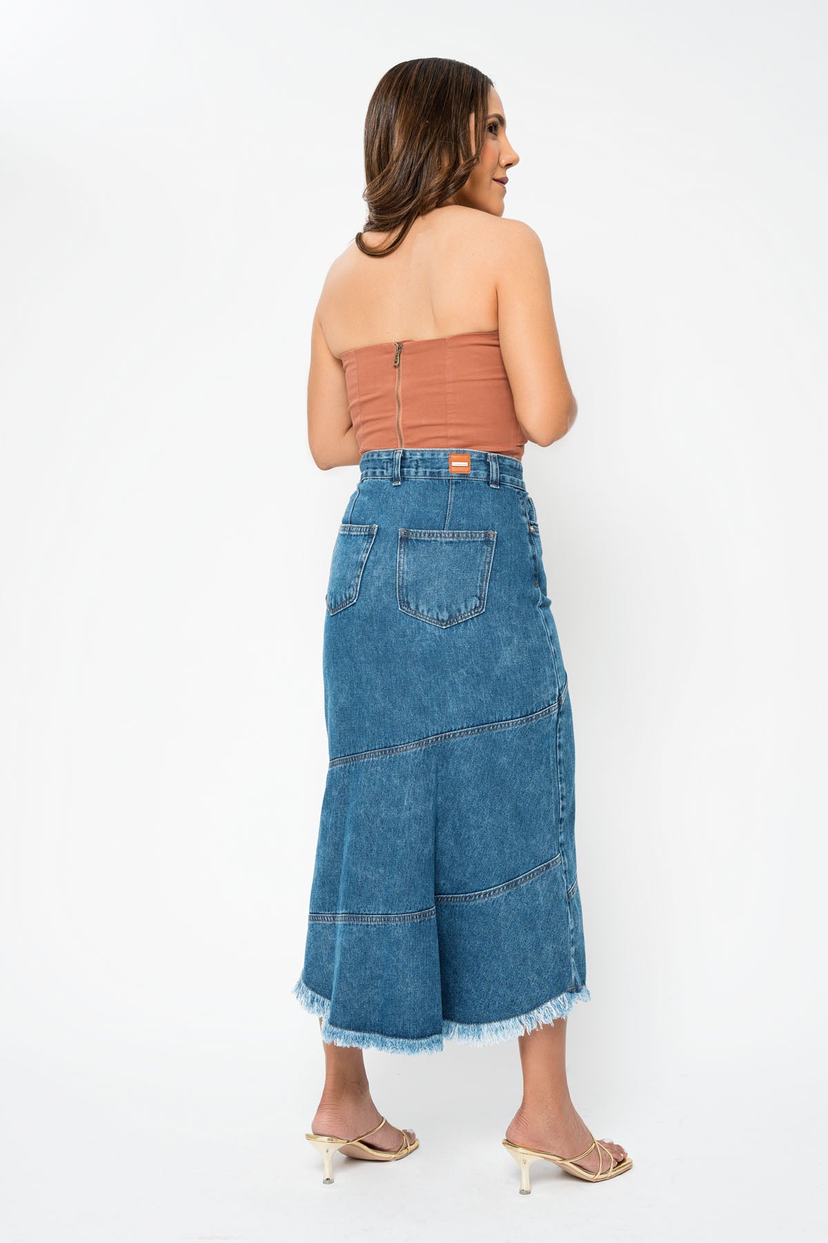 Fabricada con algodón 100% rígido, este material es conocido por su resistencia y su capacidad para mantener su forma con el tiempo. Tiene un diseño ajustado que realza la figura, especialmente en la zona de las caderas y glúteos, dando un efecto de 'levantamiento' y estilización, terminando con un vuelo al final.