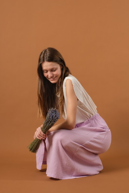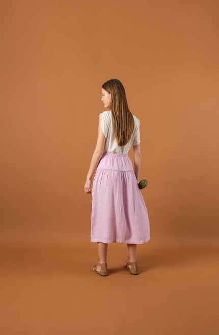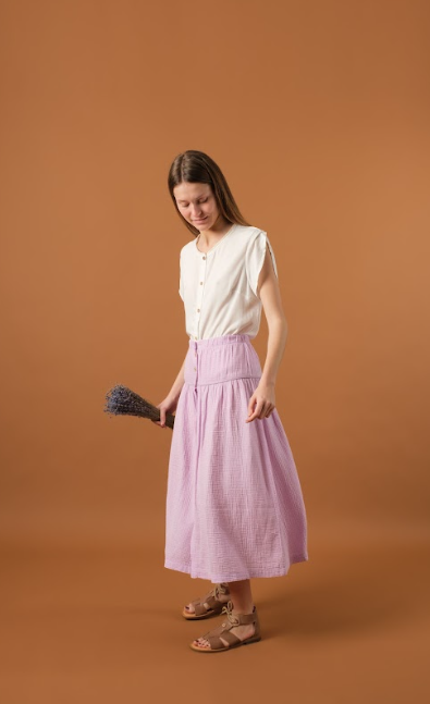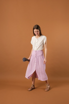 Una falda diseñada para usarla en cualquier momento del día. Tiene detalles como cortes en la cadera para acentuar la silueta y amplitud en las piernas que le dan un toque romántico a la pieza junto a sus botones que la hacen tan especial.