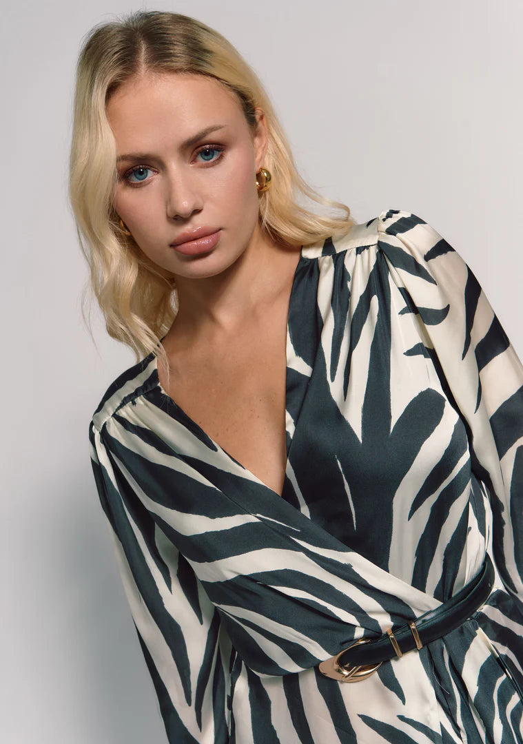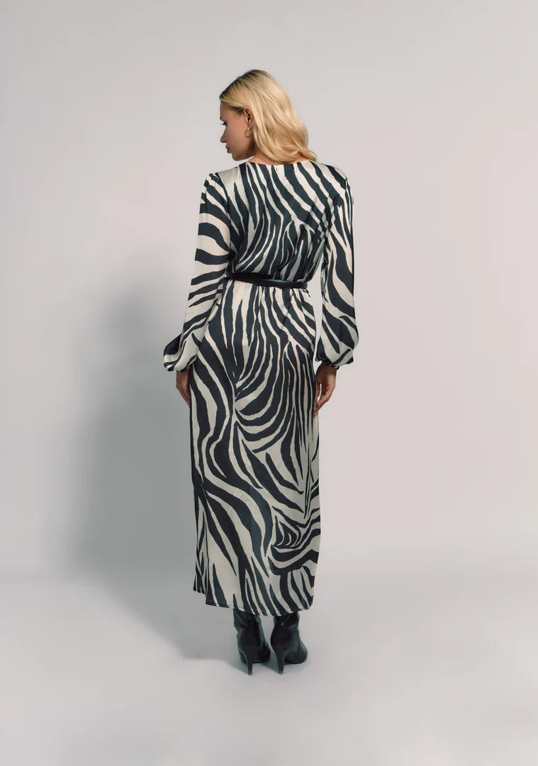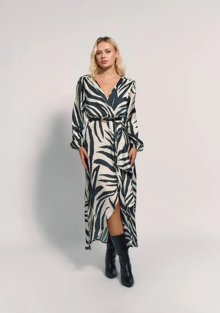 El Vestido Feline, es un vestido midi de estampado animal print en blanco y negro. Es un vestido cruzado con escote en 'V' profundo. Lleva doble forro en el pecho y es elástico en la cintura. Las mangas son largas y abullonadas con terminaciones ajustadas en los puños. El corte es asimétrico en la parte frontal.